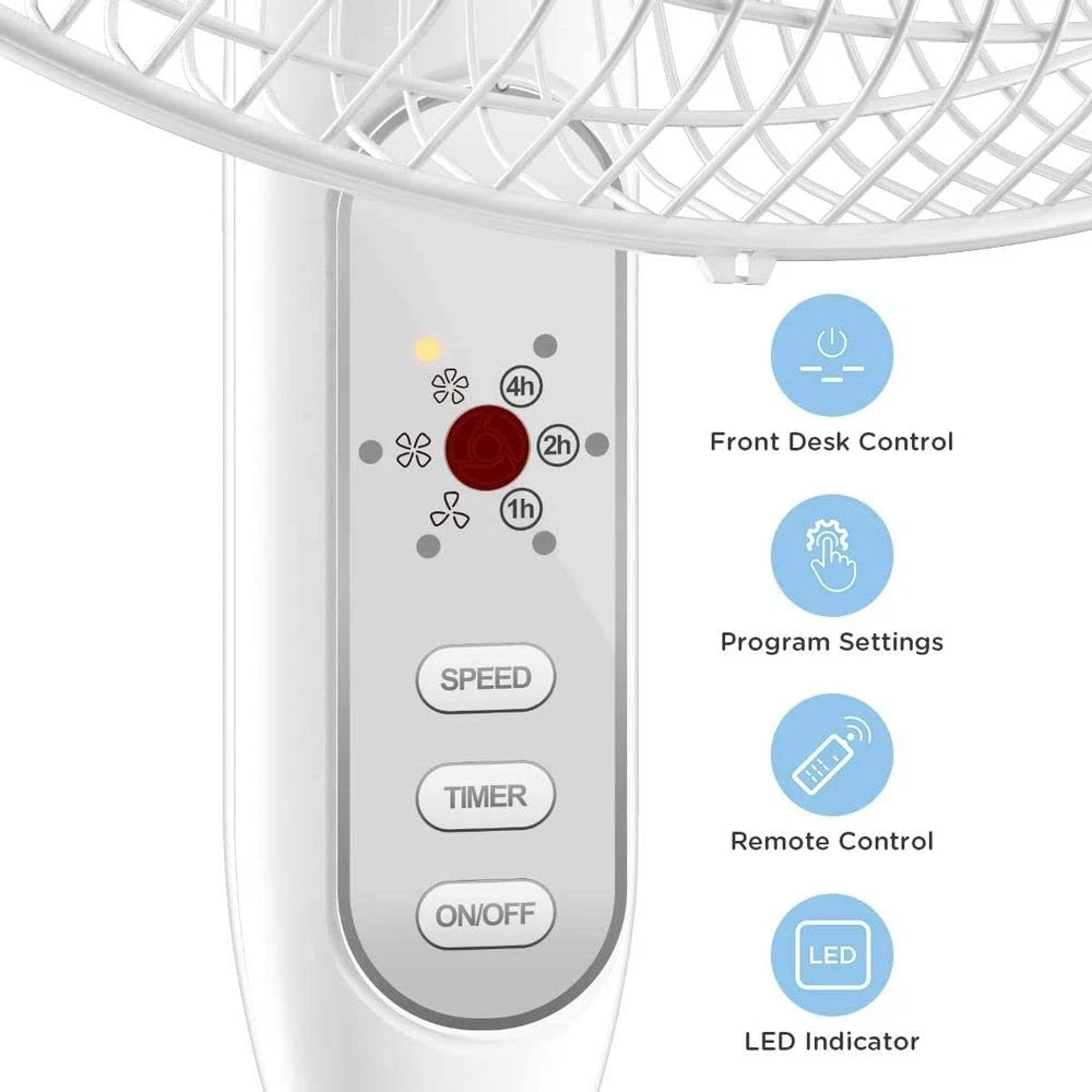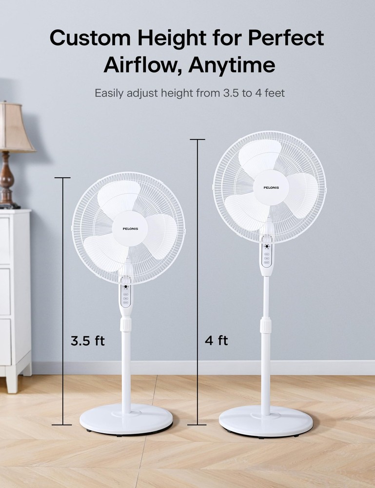 POWERFUL & EFFICIENT COOLING: Features an upgraded high-performance motor and optimized blades for stronger airflow and wider coverage, efficiently cooling medium to large rooms while consuming less energy. The 3-speed settings let you customize cooling intensity. WIDE 90° OSCILLATION & TILT: Enjoy whole-room cooling. The 90° wide-angle oscillation evenly distributes air throughout your space. Easily tilt the fan head to direct airflow precisely where you need it, from floor to ceiling. REMOTE CONTROL & HEIGHT ADJUSTABLE: Conveniently control every function (power, speed, oscillation, timer) from across the room with the included remote. Easily adjust the fan height from 3.5 ft to 4 ft (42-48 inches) for personalized comfort at your desk, couch, or bed. QUIET OPERATION & 7-HOUR TIMER: Sleep or work peacefully thanks to the fan's quiet motor. Set the auto shut-off timer for up to 7 hours for worry-free operation overnight or while away, providing comfort without disruption. STABLE, SAFE & DURABLE DESIGN: Features a sturdy, weighted base for excellent stability and tip-resistance. Built-in overheat protection automatically shuts off the fan if the motor overheats, ensuring safety and long-lasting reliability.