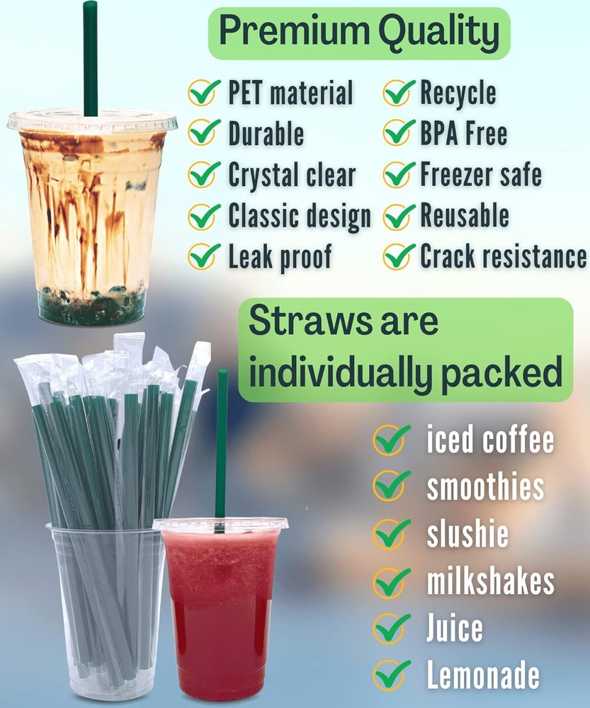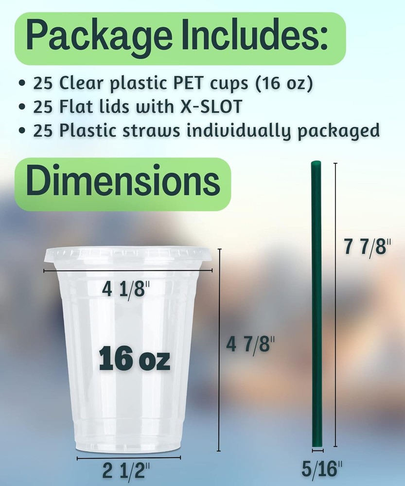 16 oz Clear Plastic Cups with Lids and STRAWS, Disposable 50 Piece Set, 16 Product Details Brand: Cappatua Color: 16 oz Special Feature: Refrigerator Safe, Break Resistant, Freezer safe, Leak proof, Style: 16 oz Cups Theme: Birthday, wedding, party, holiday, baby shower, Christmas, Halloween Recommended Uses For Product: Travel, Outdoor, Home Included Components: Straws, Flat Lids, 16 oz Clear Plastic Cups Specific Uses For Product: Cold Drinks Shape: Round Pattern: Solid Product Care Instructions: Hand Wash Only Age Range (Description): Adult Material Feature: Disposable Reusability: Disposable Unit Count: 1.0 Count Product Dimensions: 4.12"W x 4.9"H Material Type Free: BPA Free Number of Items: 25 Size: 50 Piece Set Item Weight: 1.2 pounds MaterialCapacity: Polyethylene Terephthalate (PET)16 ounces OccasionItem Weight: Anniversary, Baby Shower, Wedding, Bridal Shower, Birthday, Christmas, Cocktail Party, Communion, Confirmation, Easter, Engagement, Father's Day, Funeral, Gender Reveal, Graduation, Grandparents Day, Halloween, Housewarming, Independence Day, Memorial Day, Mother's Day, New Year, Passover, Retirement, St. Patrick's Day, Thanksgiving, Valentine's Day, Bachelorette Party, Bachelor Party, Cinco de MayoAnniversary, Baby Shower, Wedding, Bridal Shower, Birthday, Christmas, Cocktail Party, Communion, Confirmation, Easter, Engagement, Father's Day, Funeral, Gender Reveal, Graduation, Grandparents Day, Halloween, Housewarming, Independence Day, Memorial Day, Mother's Day, New Year, Passover, Retirement, St. Patrick's Day, Thanksgiving, Valentine's Day, Bachelorette Party, Bachelor Party, Cinco de MayoAnniversary, Baby Shower, Wedding, Bridal Shower, Birthday, Christmas, Cocktail Party, Communion, Confirmation, Easter, Engagement, Father's Day, Funeral, Gender Reveal, Graduation, Grandparents Day, Halloween, Housewarming, Independence Day, Memorial Day, Mother's Day, New Year, Passover, Retirement, St. Patrick's Day, Thanksgiving, Valentine's Day, Bachelorette Party, Bachelor Party, Cinco de Mayo See more 1.2 Pounds Great Value Pack of 25+25+25: The package includes 25x16oz clear plastic cups, 25 flat lids with X-slot and 25 individually wrapped straws. The straws are included, and you don't need to buy it separately. Money Saver. Make your own drinks at home or your office, and you could save money buying coffee at coffee stands. The money you spent on these cups is what you would spend in 4 days buying coffee so definitely worth it. They're durable, sturdy and the lids fit very tightly. Save Time. Tired of washing cups after party? No mess, no spills. Try these plastic cups with lids and straws. Disposable cups mean you can carry a beverage everywhere. Multi-use for any occasions. Perfect for cold drinks such as Iced coffee, Iced tea, Lemonade, Bubble boba, Smoothies to go, Juice, Soda, Frozen cocktails, Beer, Lattes Slurpee, Water and more. Perfect for birthday parties, anniversaries, road trip, BBQ or any event. High Quality. Crystal clear PET plastic cold cups with lids and straws. Food safety plastic and BPA free. Perfect for cold drinks or food.