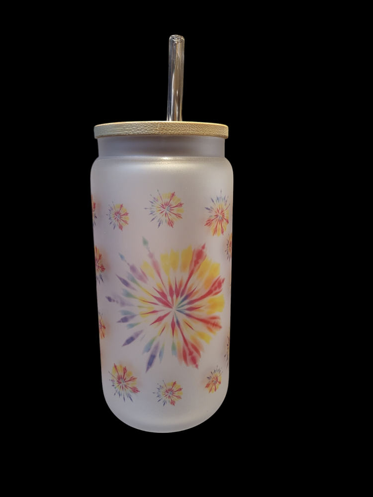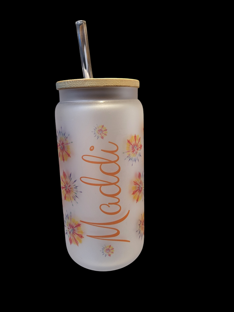 Customize frosted 16-oz 16 oz. Frosted Mason Jar with Bamboo lid and glass straw. Includes straw cleaner. Great as a custom gift. Comes in Gift Box with Ribbon. Upload desired graphic, add name. It's recommended to pick a graphic that can be a repeated as shown in the example photos as to show the frosted jar.