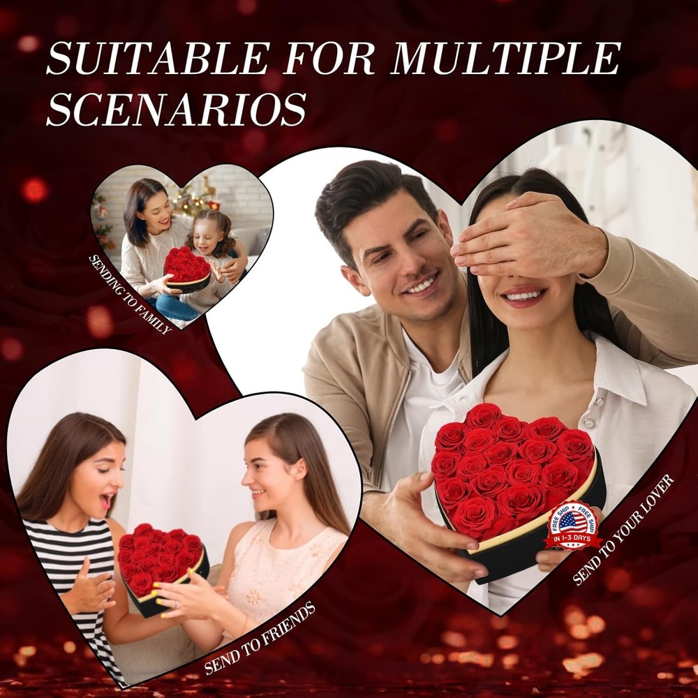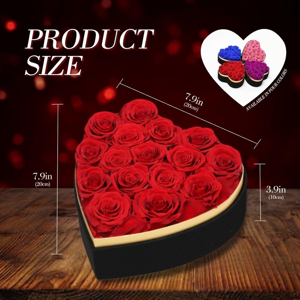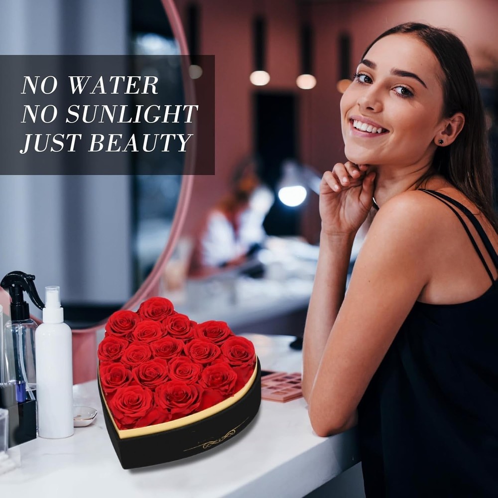 Lo que obtienes: 16 rosas rojas preservadas en una elegante caja de regalo en forma de corazón, cuidadosamente presentadas en una lujosa presentación. Un collar con la palabra "TE AMO" en 100 idiomas: una hermosa y delicada pieza de joyería. Rosas eternas: Cuidadosamente seleccionadas en su máxima floración, estas rosas se preservan con maestría para mantener su color natural y brillante durante años, sin necesidad de riego ni luz solar. Estas rosas simbolizan la belleza, la fuerza y el amor eternos, creando una declaración poderosa que durará de 3 a 5 años. Collar "Te Amo": Un collar delicado y elegante con una estructura única en forma de corazón y la palabra "Te Amo" grabada en 100 idiomas diferentes para expresarle tu amor. Este detalle único lo convierte en una muestra de tu cariño increíblemente única y profundamente personal. Regalo de lujo con caja para ella: El ramo de rosas se presenta en una caja de regalo negra de primera calidad en forma de corazón con un diseño sofisticado. Un regalo perfecto de aniversario y cumpleaños para ella, o como flores para cumpleaños de mamá, abuela, esposa o novia, o como regalo de "Te amo" para tu novia. Regalo versátil para cualquier ocasión especial: Un regalo de amor eterno y belleza. Ya sea un romántico regalo de San Valentín, un gesto sincero para el Día de la Madre, una forma de celebrar su aniversario de bodas, cumpleaños o una sorpresa "porque sí", un pequeño gesto de amor para alegrarle el día, este set transmite emoción y elegancia como ningún otro. Es la mejor manera de expresar amor a tu esposa, novia, mamá, hermana o mejor amiga.