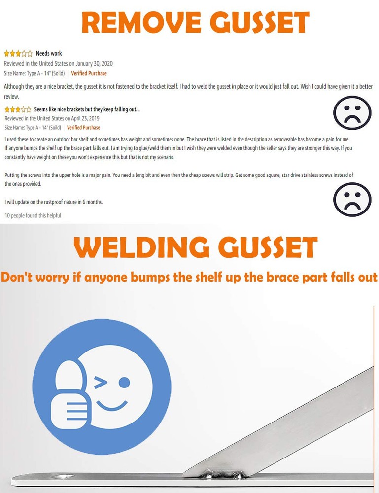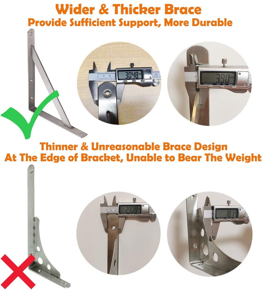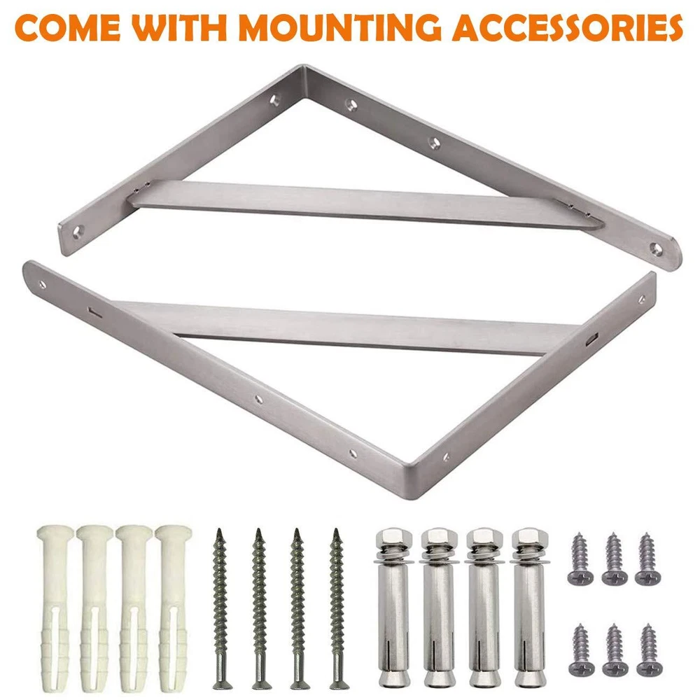 No Paint, More Durable - The Shelf Brackets are constructed of Type premium stainless steel, no paint off, more durable. Surface brushed treatment, build to resist daily scratches, corrosion and tarnishing. Throw away your paint shedding brackets Welding Gusset - Clip + Welding, so you don’t worry about the gusset will falls out when sometimes no weight on the shelf. Each side have welding point. Enough to support more weight Strong Enough, Holds a Lot of Weight - Dimensions of the brackets: 16 inches x 12 inches. Triangle structure, holds a good amount of weight, supports up to 550lb/250kg. Could be used to make a workstation in your garage, bench in your backyard, clothes table in laundry room, bookshelf, kitchen shelf, exhibition stand, Garden Shelf, External Wall Brackets etc Easy Installation - The shelf brackets are easy to mount just make sure they are straight on the studs when you do mount them. Comes with mounting accessories, High quality screws and top quality anchors Buy With Confidence - free technical support. If there are any issues or you think everything is not as advertised, please feel free to us, we will every penny of your money or give you a at no cost