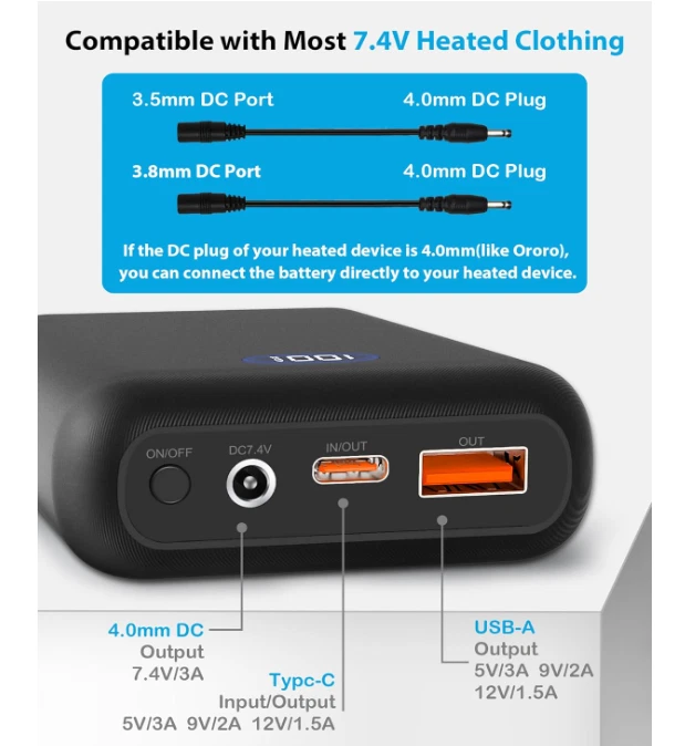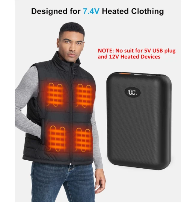16000mAh Heated Vest Battery Pack for ORORO, for Venustas, 7.4V Battery Pack for Heated Vest with 2 Adapter Cable, Rechargeable Power Bank for Heated Vest, Jacket, Pants(No for 5V Heated Devices) Connector Type USB Type C Brand Veauney Battery Capacity 16000 Milliamp Hours Color White Special Feature Digital Display About this item Battery Pack for Heated Clothing: Our 7.4V 3A power bank was designed specifically for heated clothing.(heated vest, heated jacket, heated pants) Our battery pack for heated vest are compatible with most 7.4V heated vest on the market (Note: compatible with ORORO and Venustas heated clothing, No for 5V Heated Devices ) 2 DC Adapter Cable: In order for you to better enjoy our heated vest battery, we provide 2 adapter cable from 4.0mm to 3.5mm and 3.8mm to avoid the inconvenience caused by mismatched ports. The DC interface model of the battery is: 4.0mm. If the DC output port model of your heated clothes is 4.0mm, such as ORORO heated clothes, there is no need to use a adapter cable and you can use our batteries directly. But if the DC output port model of your heated clothes is 3.5mm/3.8mm(such as: Venustas heated clothing), then you need to use the DC adapter cable 16000mAh LARGE CAPACITY POWER BANK: 16000mAh large-capacity Heated jacket battery pack, with a maximum heating time of 12 hours to meet your daily use. The heating time is: high level/6 hours, medium level/9 hours, low level/12 hours. It can be used as an extra heated vest battery pack, allowing you to enjoy more outdoor time and keep you warm at all times in the cold winter. PLUG IN AUTO-START: Our 7.4V battery pack for heated jacket are specifically designed for heated clothing. Once the battery is connected heated vest, you can directly use your vest. It automatically sleeps when not working.You don't need to open the coat and press the battery switch. MULTIPLE SAFETY PROTECTION: We adopt the latest version of the intelligent chip and high-quality Li-polymer. Battery heated vest has passed UL certification, with overcharge protection, short circuit protection, temperature control, and more. So as to ensure your safety in use WHAT YOU GET: 1x16000mAh portable power bank for heated vest, 2x DC adapter, 1x type-c cable; 1x user manual and our 24h friendly customer service. If you have any problems, please contact us and we will solve it try our best. . We offer FREE shipping on all orders! . We ship within Five business days of payment, usually sooner. . We use a selection of shipping services such as UPS, FedEx, USPS etc. . We only ship to the lower 48 states, no APO/FPO addresses or PO Boxes allowed. . Local pickups and combined shipping options are not provided at this time. . Your satisfaction is a wonderful reward for our efforts. Please assist us by leaving a positive review if you feel pleased with our service. . In the event that you encounter any difficulties related to your order, please do not hesitate to reach out to us directly through the Messaging system on the Ebay platform. Kindly consider opening a COMPLAINT or a RETURN REQUEST as a last resort, only after all other possible measures have been attempted and we have been unable to provide you with assistance. . We will get in touch with you within 24 hours and make every effort to ensure your satisfaction. . Please rest assured of our service quality.