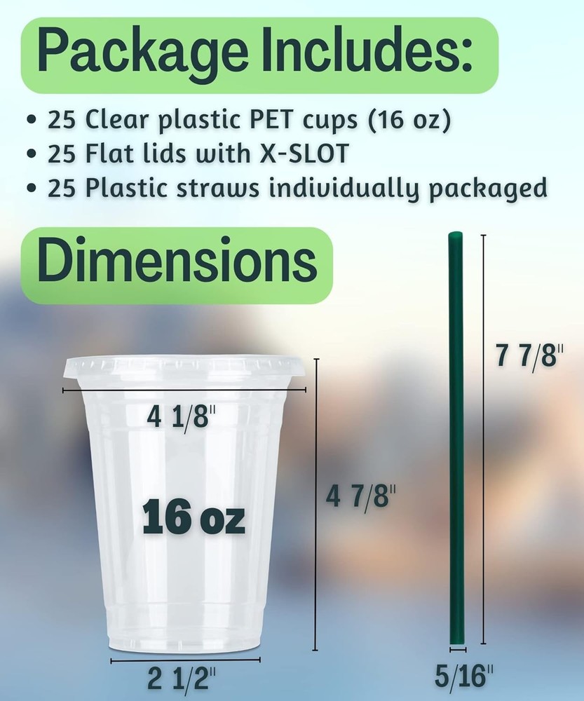 Great Value Pack of 25+25+25: The package includes 25 clear plastic cups, 25 flat lids with X-slot and 25 individually wrapped straws. The straws are included, and you don't need to buy it separately. Money Saver. Make your own drinks at home or your office, and you could save money buying coffee at coffee stands. The money you spent on these cups is what you would spend in 4 days buying coffee so definitely worth it. They're durable, sturdy and the lids fit very tightly. Save Time. Tired of washing cups after party? No mess, no spills. Try these plastic cups with lids and straws. Disposable cups mean you can carry a beverage everywhere. Multi-use for any occasions. Perfect for cold drinks such as Iced coffee, Iced tea, Lemonade, Bubble boba, Smoothies to go, Juice, Soda, Frozen cocktails, Beer, Lattes Slurpee, Water and more. Perfect for birthday parties, anniversaries, road trip, BBQ or any event. High Quality. Crystal clear PET plastic cold cups with lids and straws. Food safety plastic and BPA free. Perfect for cold drinks or food.