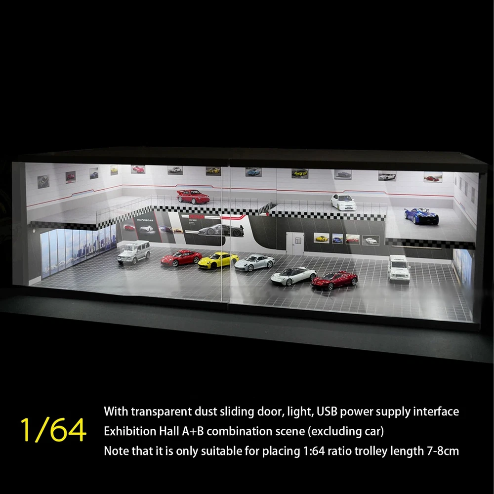 Note: This model is a simple glue-free puzzle, without the vehicles on the picture. The main body of the showroom is made of white PVC sheet, includes lights, power supply is self USB cable, has transparent dust door (left and right pull-out), and has two levels of additional railing. We highly recommend this product for use with our other Diorama scene modeling products. It can also be used with vehicle models and figure models. The playability is very high. We look forward to your combinations and play! We show some combination effect pictures in the product pictures for reference~. Product Specifications: A + B / C + C / D + D models combined full size of about: 60cm (length) * 30cm (width) * 19cm、23.62*11.811*7.48in (height) (manual measurement there is a slight error); Packaging included: 1 * garage model (as your choice) Other styles will be released later, please look forward to it~!