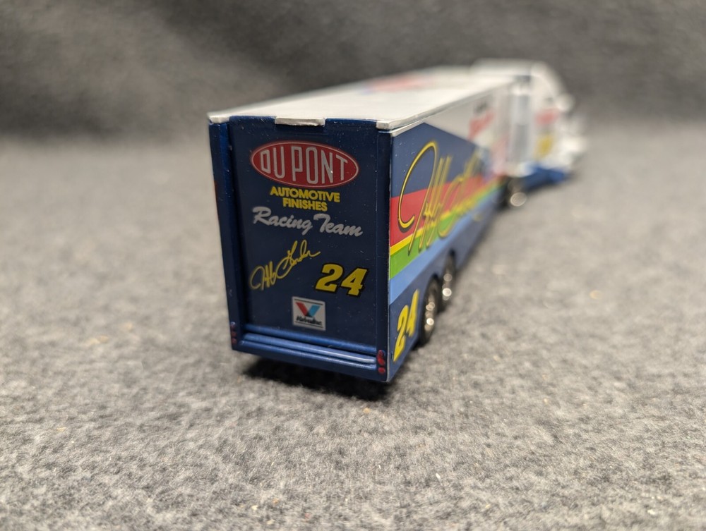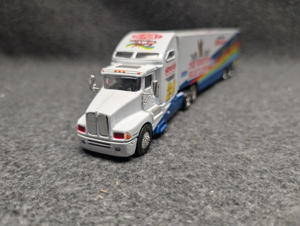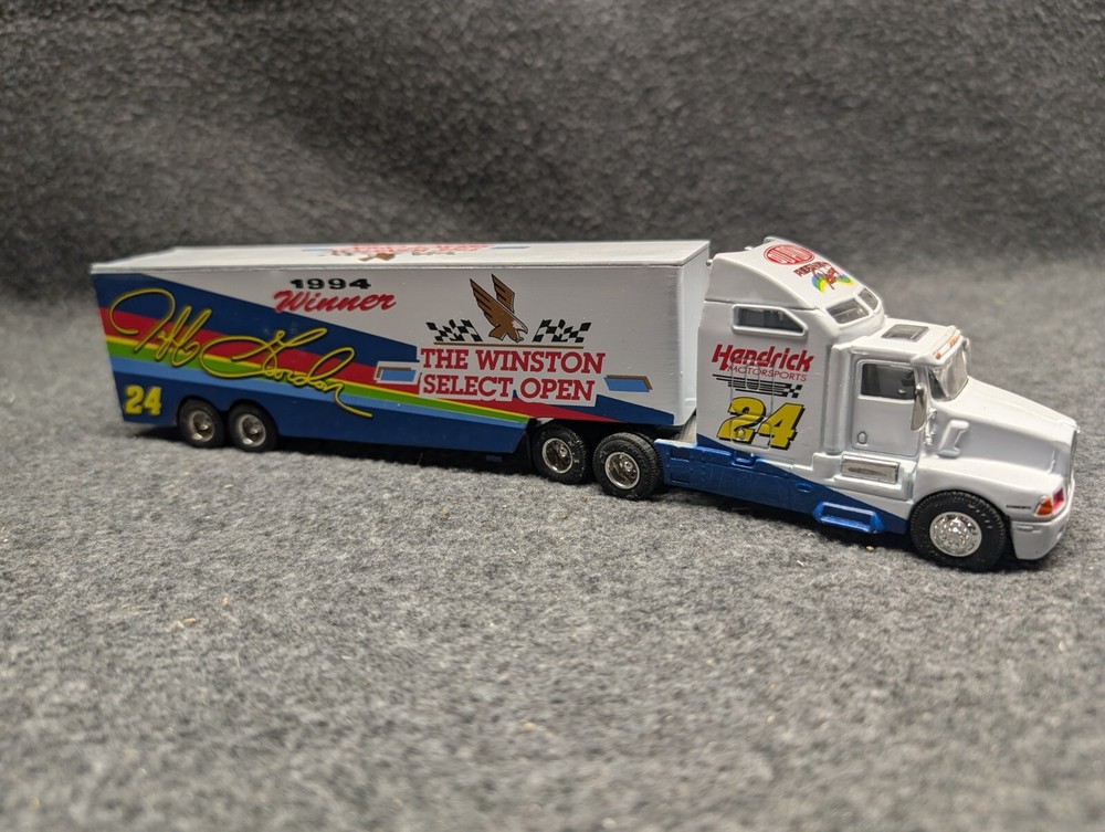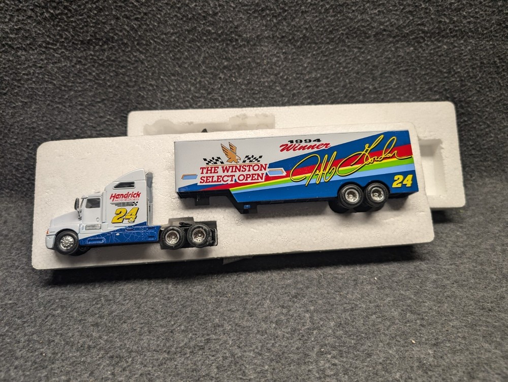 The 1/64 Jeff Gordon 1994 Winston Select Open transporter by Racing Champions is a diecast replica of a Kenworth transporter used by NASCAR driver Jeff Gordon. The multi-color transporter features authentic detailing from the 1994 racing season and is part of the Jeff Gordon racing team collection. This collectible toy vehicle is a must-have for fans of Jeff Gordon and NASCAR racing, offering a small-scale representation of the transporter used during the Winston Select Open races.
