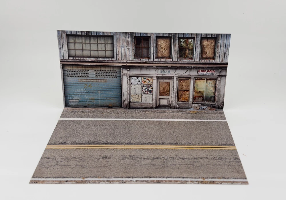 093 Please read the description. Vehicles and people are not included. Thank you for looking, this item is %100 paper and it was designed to be a photo prop for your Diecast Photography, but they make great displays to show off your collection. The uses are only limited by your imagination. The size of this Paper Pop Up Diorama is 6 inches wide, the height is 3 inches tall, the base is 4 Inches, overall it’s a 6x7. This Pop Up Diorama is one piece and is ready to use immediately. Printed on flat Matte Photo Paper with a flat color profile. I print these Photo Props in such a way that compliments most cameras shooting in RAW as I only print after I have taken the display photos and feel confident that the colors are set well so that the customer will get the most out of their photography with minimum editing (but photography is subjective and at least I tried :). Why the black backing? Well for two reasons, the black backing adds stability to the prop and most importantly to know is the black backing adds depth to the colors, it really brings the best out of them especially when you consider that matte photo paper is relatively thin and back lighting bleeds through but the backing prevents this. These Pop Up Diorama’s are made to order and usually ships out the next day but in some instances I might need an extra day. Please take note that these Pop Up Diorama Photo Props are made from %100 paper and I know I already mentioned this but experience has taught me I should really make sure that it’s conveyed to potential buyers so that you feel like you got what you expected. The small tab located on the back near the bottom is there convenience reasons and the most important reason is positioning. This tab will help you position the Pop Up Diorama vertically and it really helps. Please examine the item photos so you can judge if the Pop Up Diorama is right for you and notice how the back tab is working. Thank you for your interests in these items and I hope they work well for you.