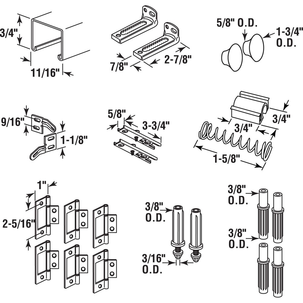 Used for the installation and repair of bi-folding closet door systems. Kits like these are available for 24 inch, 30 inch, 36 inch, 48 inch, 60 inch and 72 inch openings This kit is for use in a 30 inch wide closet and wardrobe door opening, and it includes a 47-3/4 inch net track length, pre-cut for ease of installation The roll-formed track is constructed of steel and comes pre-drilled in a white-painted finish Components in this kit are constructed of steel, plastic and wood Vertical adjustment features are included on the top and bottom pivot brackets, with a height adjustment feature on the bottom pivot