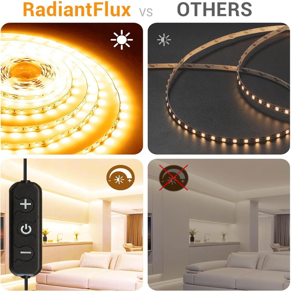 These LED strip lights are amazing! Super bright and easy to dim with the included remote, they give my bedroom a cozy warm glow. The 16.4ft length is perfect, sticking easily under cabinets and around mirrors. Love how flexible and durable they are—no flickering or overheating. Perfect for adding ambiance anywhere indoors!