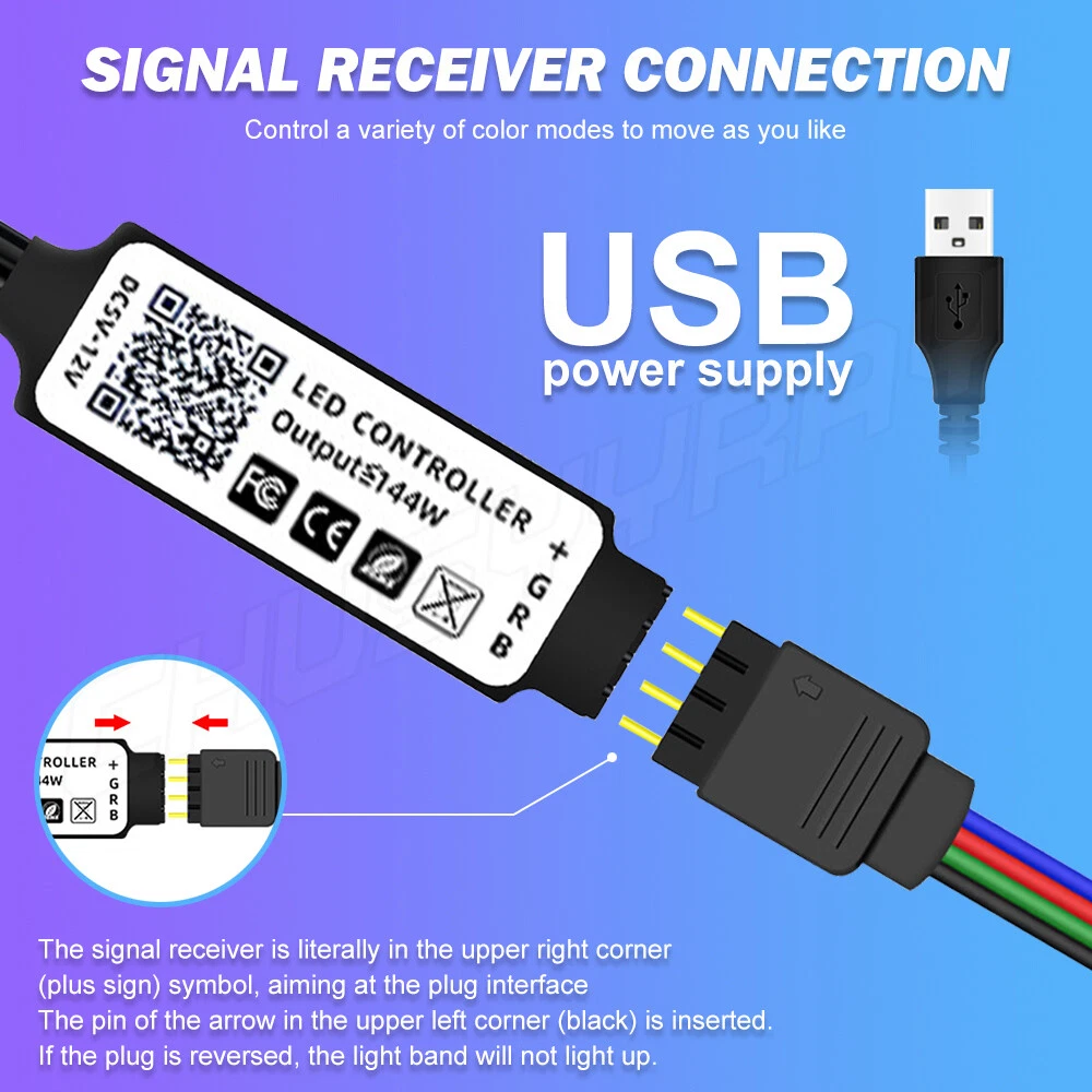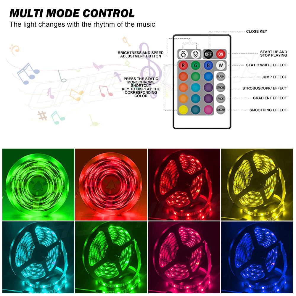 Note: 1.The 16.4 ft (5m) kit cut requires additional purchase of the controller link. 2.100% Brand New & Excellent quality Fast & free shipping from , US 3.The power supply is a USB interface Specification: * LED Type: SMD 5050 * Color: RGB * LEDs: 60pcs/m * Working Input Voltage: DC 5V * Working Power: 4.8 W/m * Working Current(5 m): 2A (total 5A or above) * Flux: 900 lm/m * Protection Rate: IP65-Waterproof * Length: 5m[16.4 ft]/Roll * Working Temperature: -20°C to 60° * PCB Background: Black *Power plug: USB power plug *Music function: dance with the music *Controller: mobile phone APP + 24k remote control Package included: 16.4FT 5M RGB 1 x Waterproof 5050 RGB LED Strip (5M) 1 x 24 Key IR Remote 1 x IR Controller(USB power interface) 1 x User Manual Features: • Waterproof Flexible LED Strip Kit: Waterproof 5050 RGB strip light and IR Controller and 24 Key Remote. Super bright but running at low temperature, low energy consumption, less heat radiation. (Without power plug) • Color Changing: Light strip with 24keys IR remote controller for the LED tape can fit your all changing demand. You can choose different colors, adjust brightness, turn on/off. Stable lighting LED chips allows the LED lights to be very colorful and durable. • 24 key IR Remote Controller: 8 Light patterns: Quick / Slow / Auto / Flash / 7 color fade change / 3 color fade change / 7 color jumpy change / 3 color jumpy change/ R / G / B increase and decrease control. 6 DIY keys for memories the colors what you preferred. • Memory Function: This LED strip lights have memory function. When the strips are used again, they remember the last mode settings without having to repeat the settings. • Easy Installation: Strong self-adhesive tape holds strip light safely and securely. Cuttable and linkable, cuttable of every 9 LEDs, easy to fit all shapes decoration. Widely Use: IP65 waterproof design allows the strip light to be utilized both indoors and outdoors. Perfect for home lighting, festival decoration, activities, hall, hotels and other decorated. Light strip installation method: There is adhesive on the back of the light strip. If it is not sticky enough, you can use glass glue or other double-sided adhesive at home to reinforce So many apps: under the pool table Architectural decorative lighting, arches, canopy backlit mirrors or pictures Under kitchen cabinet lighting, baseboard lighting. Real mood lighting in home theater, bar lights. Corridor lighting, stair accent lighting. Hidden lighting, halo effect, perfect for greenhouses Backlight of the logo/letter. Channel letter lighting. Path/Decorative Lighting. Bay/Paint Track Lighting. Edge-lit acrylic panel light. Disclaimer: Any injuries or damages caused by this product or the use of this product are the sole responsibility of the end user or purchaser. No recourse to the manufacturer and/or seller whatsoever.Thank you! Note: The power supply is a USB interface