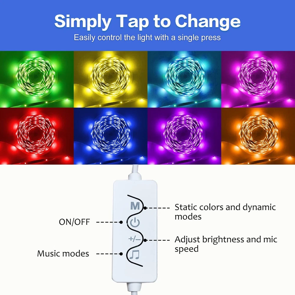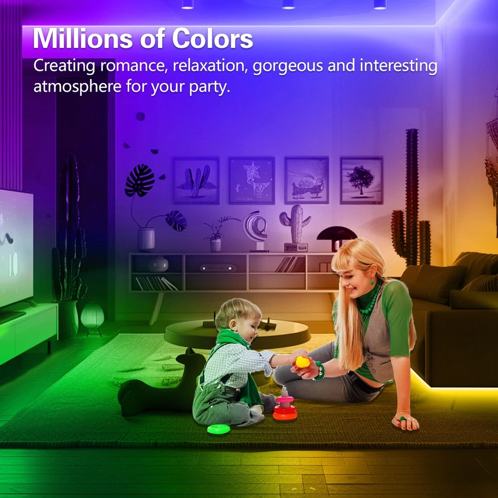 Features: Wireless Smart App: The APP allows you to control led lights for bedroom or TV via WiFi and Bluetooth and access to incredible features like the different scene modes and a convenient Timer function. A perfect led lights for room,TV,kitchen etc.(Support 2.4GHz WiFi Only) Hands-Free Voice Control: The Smart LED strip lights work with both Alexa & Google Assistant. The led lights for tv can free up your hands and power your tv led lights on and off, change colors, or adjust brightness with simple voice commands. And control your lights for bedroom without lifting a finger. Music Sync: With built-in mic the led lights allow the smart tv led backlight to sync to any music type. Use our led strip lighting you can dance and move to the rhythm of your favorite songs. It is great for more relaxed get-togethers. Timer & schedule : You can schedule the alexa led light strips automatically switch on/off via your phone app.Set the wifi led lights for tv to turn on or off at a specific time. Turn all lights on when you wake up or turn all lights off when you are away from home. Easy Installation: Our light kits come with a strong adhesive and USB controller. It's easy to install and you can use the adhesive to mount the RGB LED strip lights to any dry, clean surface. The led strip lights equipped with short circuit protection.