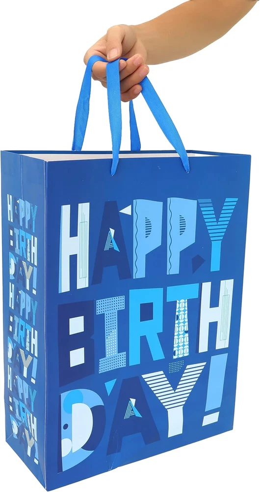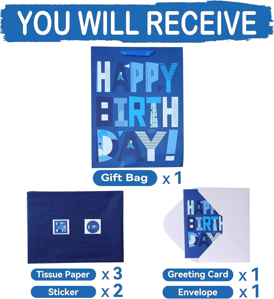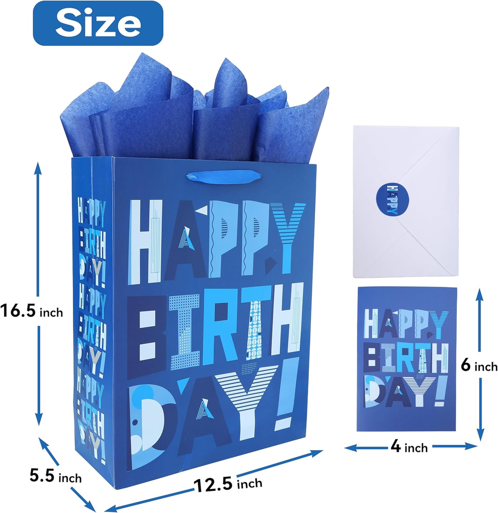 UNIQUE DESIGN: The main element of the design is a cartoon-shaped "Happy Birthday" motif, which adds a playful touch to the overall appearance, while the vibrant blue color symbolizes serenity. This combination captures the spirit of celebration, creating an eye-catching and delightful gift presentation. ULTIMATE SET FOR EASY GIFT GIVING: You will receive 1 extra large gift bag, accompanied by 3 sheets of blue tissue paper for effortless wrapping or decoration. Additionally, you'll find 1 greeting card of the same design, complete with 1 accompanying envelope, providing the perfect canvas for you to express your heartfelt wishes. The included 2 stickers add a sense of ceremony to your gift-giving experience. VERSATILE USE: This adorable gift bag is guaranteed to bring joy to friends, lovers, kids, mothers, fathers, and parents alike, making it perfect for celebrating Birthday Parties, Baby Showers, Kids' Birthday Parties and other special occasions for loved ones. PERFECT SIZE FOR SMALL & BIG GIFTS: The pretty extra-large gift bag measures 12.6” W x 16.5” H x 5.5” D, making it the perfect size for holding electronic devices smartphones, tablets, Clothing, shoes, handbags, or designer accessories and more. It is ideal for gifting a wide range of items such as High-quality chocolates, necklaces, bracelets, earrings, or rings, books, art supplies, sports equipment, or cooking utensils. ECO FRIENDLY AND HIGH-QUALITY: Expertly crafted from premium paper materials, these eco-friendly gift bags are not only stylish but also sustainable. Designed to support up to 10 pounds, they are made with paper sourced from responsibly managed forests, ensuring their environmental friendliness. UNIQUE DESIGN: The main element of the design is a cartoon-shaped "Happy Birthday" motif, which adds a playful touch to the overall appearance, while the vibrant blue color symbolizes serenity. This combination captures the spirit of celebration, creating an eye-catching and delightful gift presentation. ULTIMATE SET FOR EASY GIFT GIVING: You will receive 1 extra large gift bag, accompanied by 3 sheets of blue tissue paper for effortless wrapping or decoration. Additionally, you'll find 1 greeting card of the same design, complete with 1 accompanying envelope, providing the perfect canvas for you to express your heartfelt wishes. The included 2 stickers add a sense of ceremony to your gift-giving experience. VERSATILE USE: This adorable gift bag is guaranteed to bring joy to friends, lovers, kids, mothers, fathers, and parents alike, making it perfect for celebrating Birthday Parties, Baby Showers, Kids' Birthday Parties and other special occasions for loved ones. PERFECT SIZE FOR SMALL & BIG GIFTS: The pretty extra-large gift bag measures 12.6” W x 16.5” H x 5.5” D, making it the perfect size for holding electronic devices smartphones, tablets, Clothing, shoes, handbags, or designer accessories and more. It is ideal for gifting a wide range of items such as High-quality chocolates, necklaces, bracelets, earrings, or rings, books, art supplies, sports equipment, or cooking utensils. ECO FRIENDLY AND HIGH-QUALITY: Expertly crafted from premium paper materials, these eco-friendly gift bags are not only stylish but also sustainable. Designed to support up to 10 pounds, they are made with paper sourced from responsibly managed forests, ensuring their environmental friendliness.