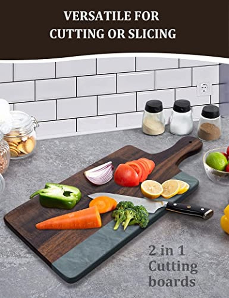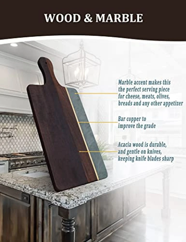 Cutting Board with Marble and Wood, 16.5”X 7” Cheese Board with Handle,Serving board for Bread, Cheese, Meat, Fruits, and Vegetables, Charcuterie Boards for Kitchen as Serving Trays Product Details Brand: FKKsparkler Color: White Product Dimensions: 16.5"L x 7"W x 0.6"Th Material: Acacia Wood, Marble Recommended Uses For Product: Kitchen Shape: Rectangular Product Care Instructions: Not Dishwasher Safe Special Feature: Seamless transition from wood to marble Item Weight: 2.31 Pounds Number of Items: 1 Brand: FKKsparkler Color: White Product Dimensions: 16.5"L x 7"W x 0.6"Th Material: Acacia Wood, Marble Recommended Uses For Product: Kitchen Shape: Rectangular Product Care Instructions: Not Dishwasher Safe Special Feature: Seamless transition from wood to marble Item Weight: 2.31 Pounds Number of Items: 1 Size: 16.5"L x 7"W UPC: 787996001067 Item Weight: 2.31 pounds Item model number: FK-CBWH Date First Available: September 2, 2022 Seamless transition from wood to marble: Acacia wood of cheese board is tightly attached to the marble and is not easily separated.Cutting Board with marble and wood no clear glue lines and others common imperfections. Sturdy handle: Cheese board with handle is made of high quality acacia wood and is not easy to break. Food can be safely moved from the kitchen to the living room or other areas. Use strong packaging to ensure that well wrapped is delivered safely and in good condition. Easy to clean: Washes easily by hand.We recommend not putting acacia wood cutting board in the dishwasher or soaking it to avoid damaging the surface.Just wash it with water and soap. Tough and beautiful: Serving board with perfect firmness and softness, it can prevent your tool from becoming dull.Functional and also looks great on display in the kitchen.Marble cheese board with marble and wood can be used to cut bread, cheese, meat, vegetables, fruits and pizza. Perfect gift: The wood inlay in the marble creates a stunning design. Heavy and sturdy, this cutting board/serving platter is a great value and would be a nice gifting item.Functional and also looks great on display in the kitchen. Decorative cutting board with marble and wood can be used as cutting boardscharcuterie boardsserving board.