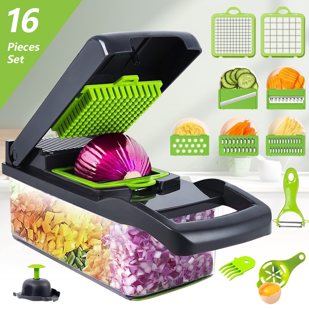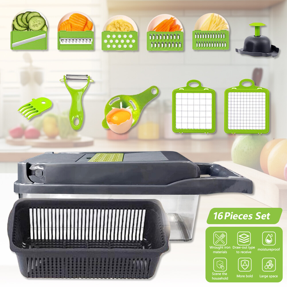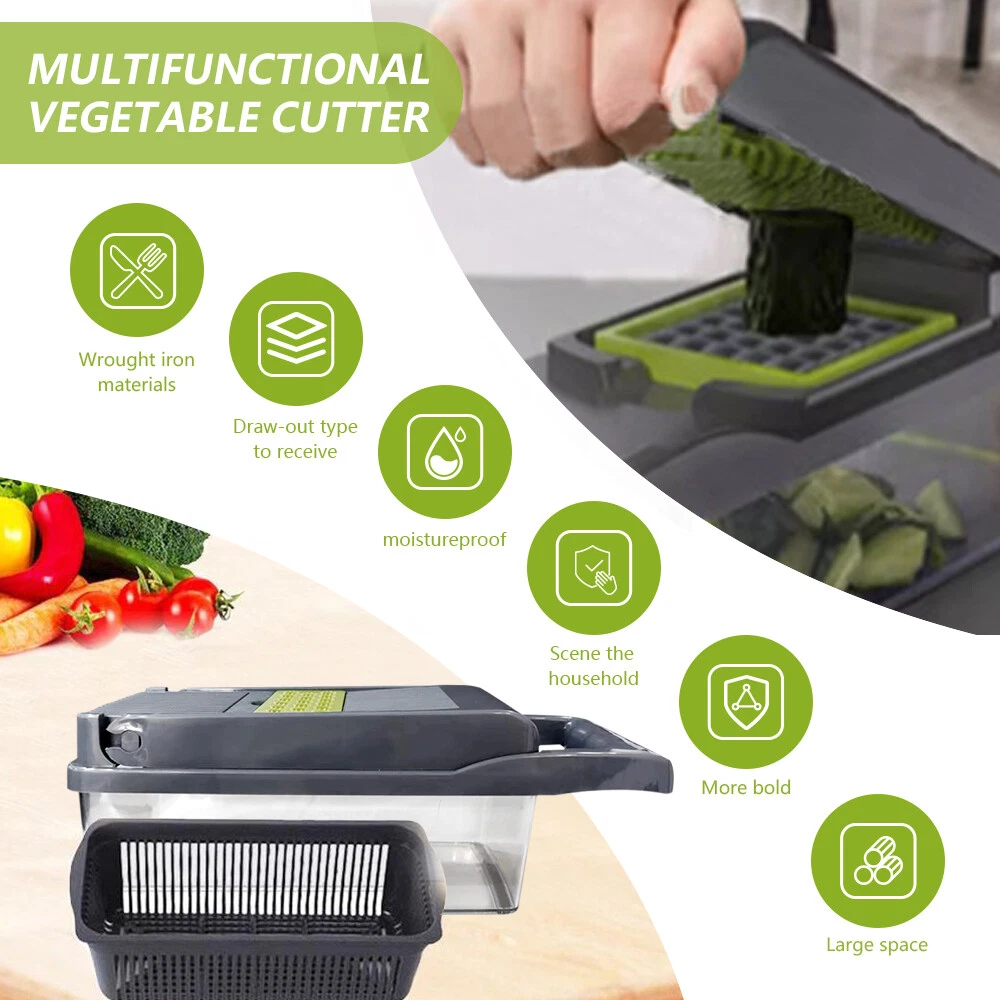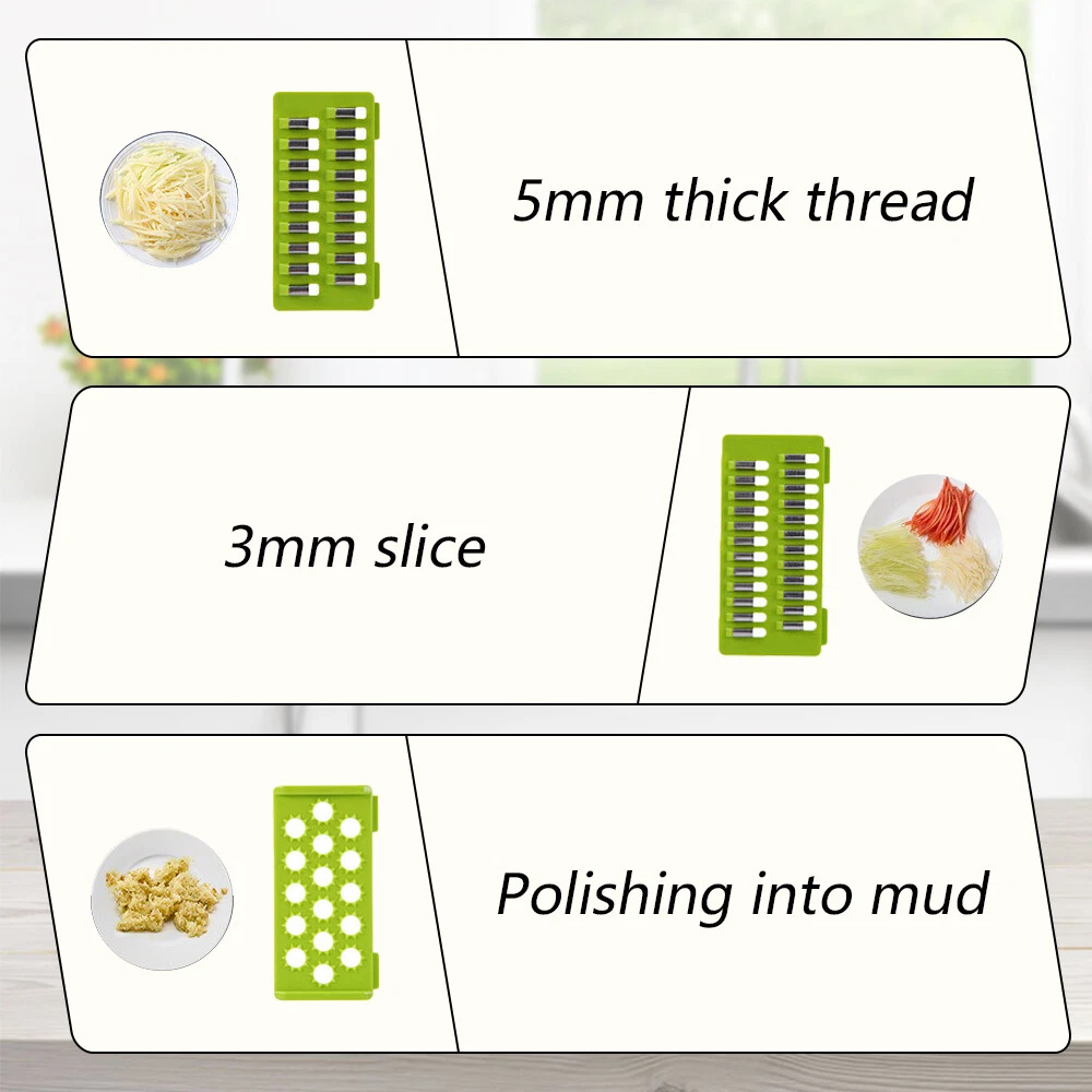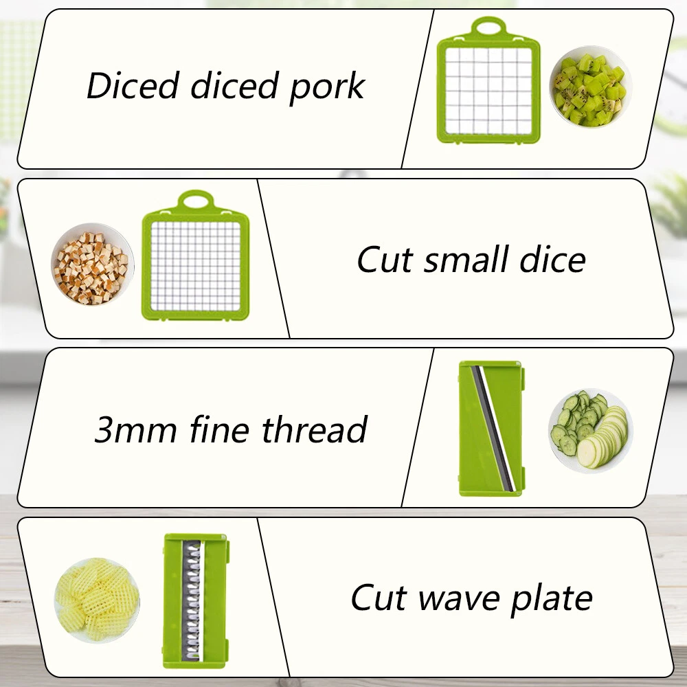Feature: 1 6 in 1 Multifunctional vegetable chopper allows you can get big or small dices, thick or thin slice, shreds or julienne. Easy to chop onion, mushroom, cucumber, carrot, potato, ginger, garlic, cheese. Easy disassemble and installation. Our vegetable chopper is made of high quality stainless steel, BPA-free professional grade, heavy duty reinforced food grade ABS for superior break resistance. With grip handle enhances leverage while the non-skid rubber strip ensures stability during use. Safe and easy to slice, dice, chop and cut fruits and vegetables. Builtin chop lid lets you cut foods directly into the 1.2L collection tray without messing up knife and cutting board. Our food chopper and dicer can be completely disassembled for easy cleaning (Note: Hand wash ONLY, can not be used in dishwasher) Multi-Functional interchangeable blades, through which you can get big or small , thick or thin slice, shreds or julienne. Easily handle vegetables such as onions, garlic, carrots, potatoes, cucumbers and various fruits. Premium Quality, Made of stainless steel and ABS material discs. No bending and Rusting. Premium break resistance, rubberized non-skid base ensure stability and safety. Safe To Use, The unique non-slip handle design makes cutting more effortless and prevent hand injuries. The bottom of the vegetable cutter is designed with non-slip silicone feet, which can greatly increase the stability when cutting vegetables. Saving Time, Vegetable Chopper can help you shorten Prep time comparing with traditional blades chopping. One-key Cleaning, After cutting, press the PUSH button to remove residues on the cutting board quickly. The drain basket can not only store things but also quickly clean the fruits and vegetables in it. Package Included: 16in1 Vegetable Chopper Note: Due to the difference between different monitors, the pictures may not reflect the actual color of the item. Compare the detail sizes with yours, please allow 1-3 cm error, due to manual measurement. Please leaving a message before you give the bad feedback, if the products have some problems