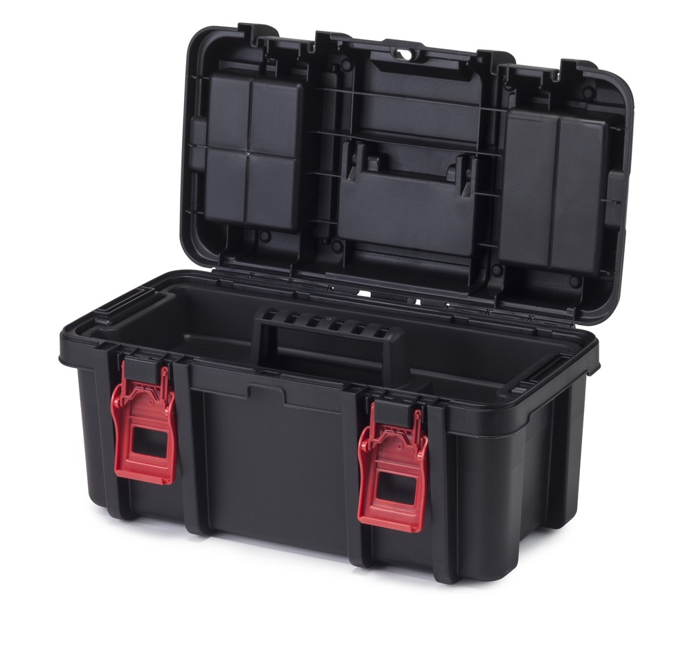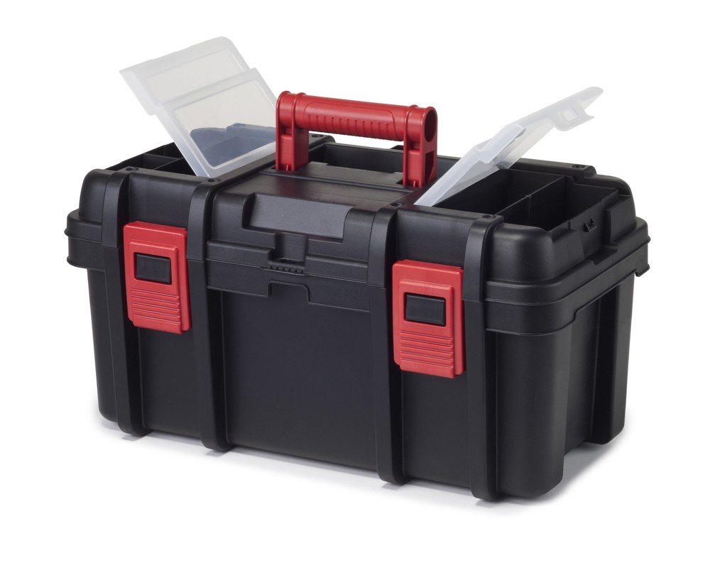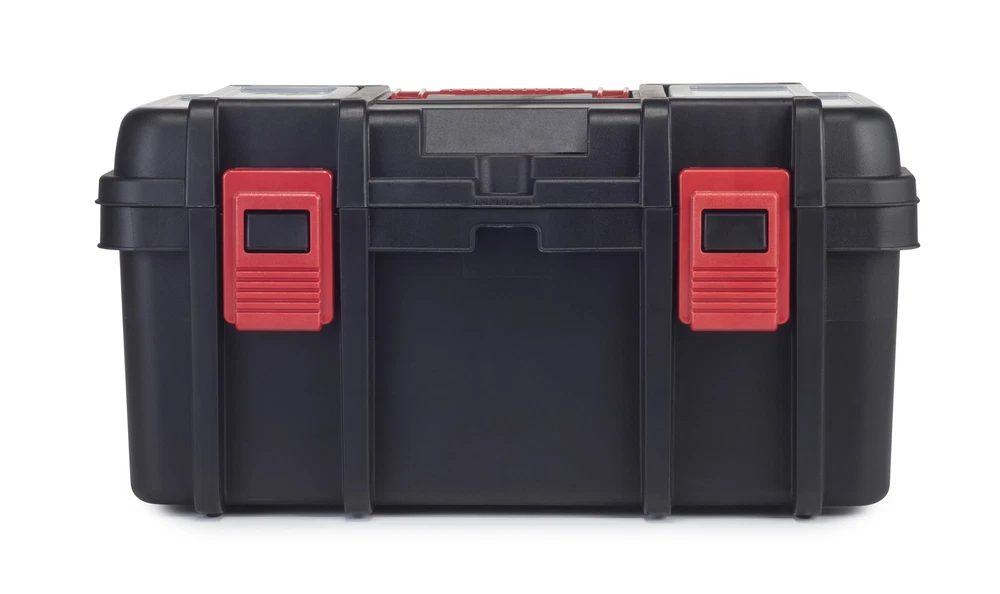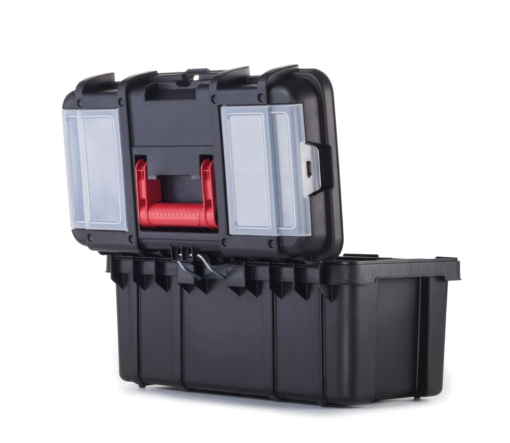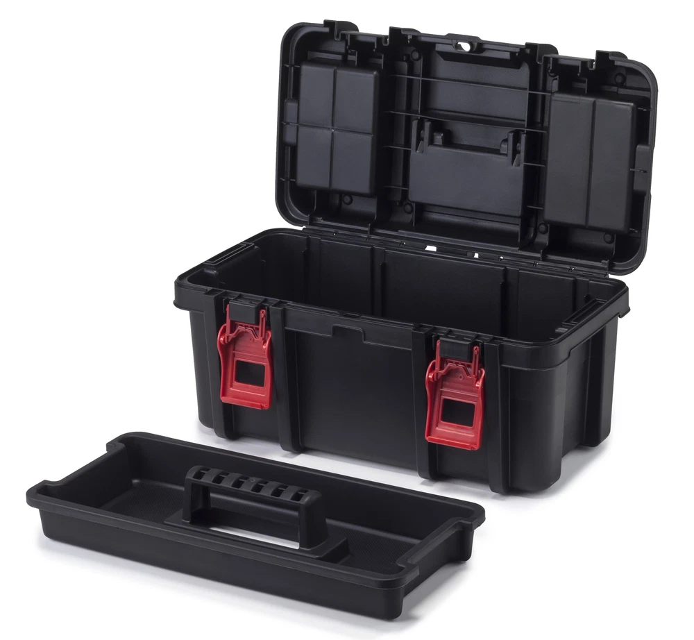 The 16-Inch Toolbox was designed with the ambitious DIYer in mind but this heavy-duty tool box comes with plenty of pro functionality. The integrated lid organizers boast clear lids so you can see the contents in an instant. A removable utility tray allows for easier hand tool transportation so you can keep your more frequently used tools within reach. Easy to haul around from the garage to the back yard, the tool box comes with a central carrying handle. A metal lid stopper guarantees that the lid stays open for as long as you want it to, without collapsing as you search for components inside the box. The pad lock ready eye offers a convenient security upgrade method to keep your tools secure (lock not included). 16-Inch Toolbox, Plastic Tool and Hardware Storage, Black Features: 16.15 x 8.70 x 8.30 Inches Portable tool box 2 integrated lid organizers with clear lids Removable utility tray Carrying handle Metal lid stopper Pad lock ready (lock not included) Heavy-duty construction
