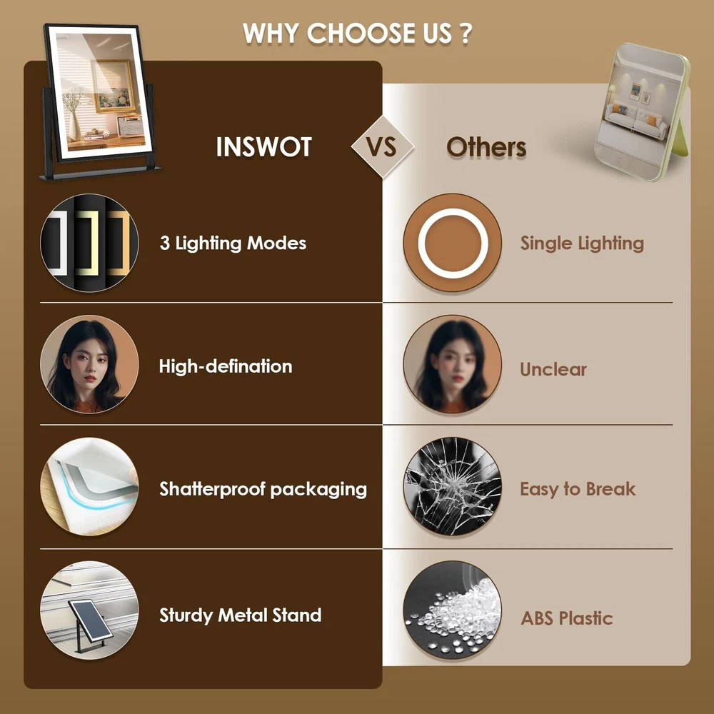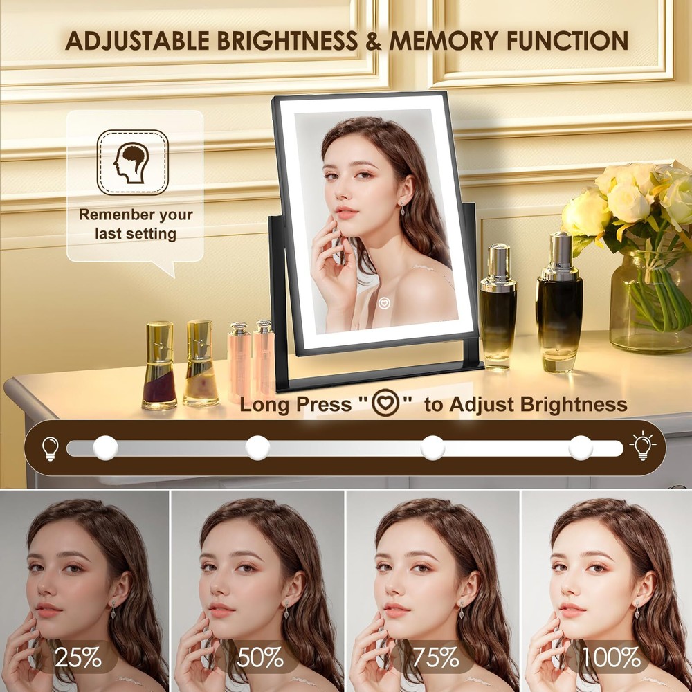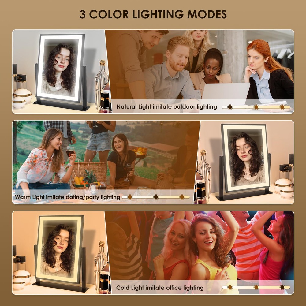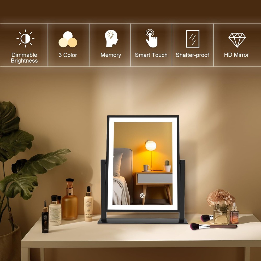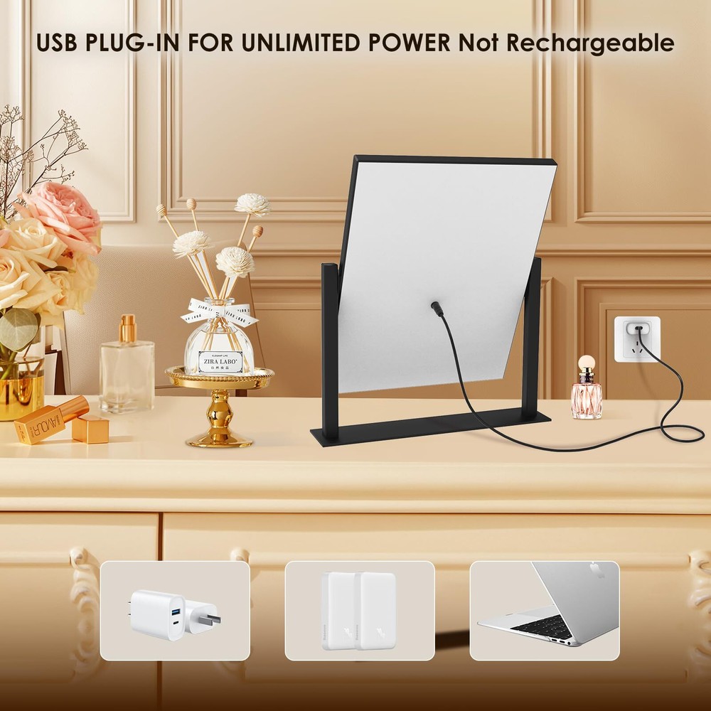 【3 Color Modes & Adjustable Brightness】lighted vanity mirror built-in eye protection LED light strip, offers three color lighting modes: Natural light, Warm light and Cold light. Long press to adjust the light brightness between 10%-100%. The dimmable makeup mirror with light can meet the different personal makeup needs of different occasions. 【Smart Touch Control & Memory Function】The smart touch button of LED vanity mirror provides a sleek and modern look. Easy to use by touching the light button. The memory function of light up mirror for makeup can keep the light settings just like the last time it was used, allowing you to save your preferred lighting settings for your next use. 【Sturdy Frame & 360°Rotation】The desk mirror with light features a robust U-shaped stand made of strong metal, making the LED mirror makeup more stable and durable. 360-degree rotation allows you to see more detail, convenient for you to select the ideal viewing angle or position. 【Elegant Design】 Come with a 5V DC charging cable so that you can plug it into any USB interface. Corded vanity mirrors can provide more than 30% brightness than other battery power supply methods. ( Not rechargeable, charger not included ) 【Perfect Present Her & 2-Year Satisfaction Service】 Our HD lighted tabletop mirror is a thoughtful, practical and stylish present for any great moments such as Valentine's Day, Mother's Day, Birthday, Christmas, anniversary, etc. White desk vanity mirrors also can be widely used in bedrooms/beauty salons/dressing rooms. If you encounter any issues with our light up vanity mirror, please simply reach us & we'll provide a replacement .