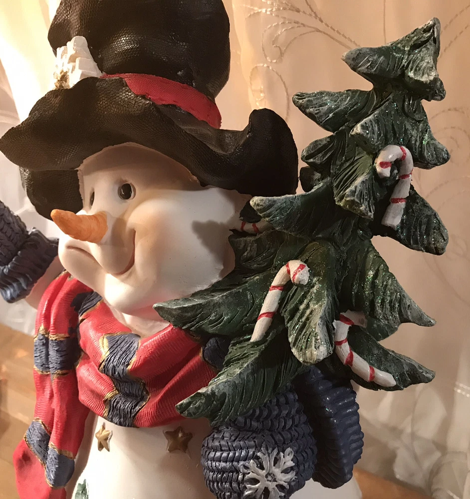 Snowman Figure with Candy Cane Tree 16” tall. Measurements approximately: 16” tall 10” wide