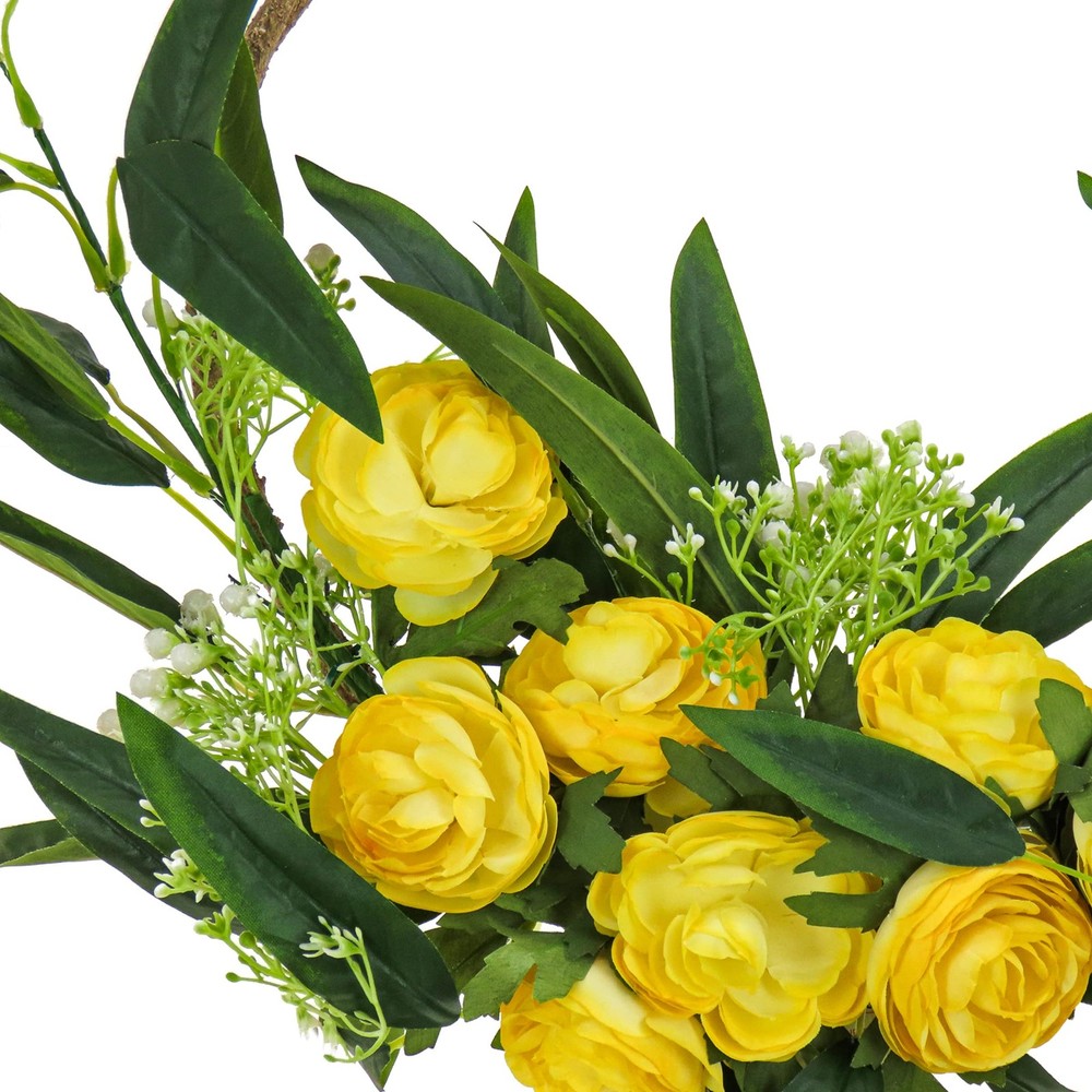 LIFELIKE ARTIFICIAL FLORAL WREATH: This summer wreath features vibrant buttercup blooms, delicate baby’s breath, and flowing green stems. This floral home décor beautifully represents the colors and textures of spring, creating a cheerful and welcoming atmosphere for any room or front door. VERSATILE HOME DÉCOR: This floral wreath is ideal for hanging on doors or windows as part of your spring or summer décor. It’s perfect for both entryways and living rooms, adding a fresh, floral touch to your home. This floral door wreath can also be hung in covered outdoor locations, bringing a festive touch to your porch, patio, or balcony. It’s also a charming addition to mantels, dining tables, or as a centerpiece for holiday-themed gatherings, enhancing any room with its vibrant, spring-inspired design. QUALITY MATERIALS: Crafted from high-quality materials, this wreath features a hoop ring base, designed to maintain its beauty and integrity for years to come. The durable construction ensures it can withstand seasonal use, providing long-lasting, vibrant décor that retains its charm even after multiple springs and summers. Whether displayed indoors or in covered outdoor areas, this wreath is built to stand the test of time with minimal maintenance. EASY TO MAINTAIN: Simply take this summer décor out of the box and shape it to your desired look. No need for watering or pruning—this wreath requires minimal upkeep. Simply dust it once a month to keep it looking vibrant, fresh, and full of seasonal charm. FAUX FLORAL WREATH DIMENSIONS: 4”L x 16”W x 16”H, 1 lb. Perfect for both indoor and covered outdoor use, this wreath is a seasonal must-have for your home’s décor.