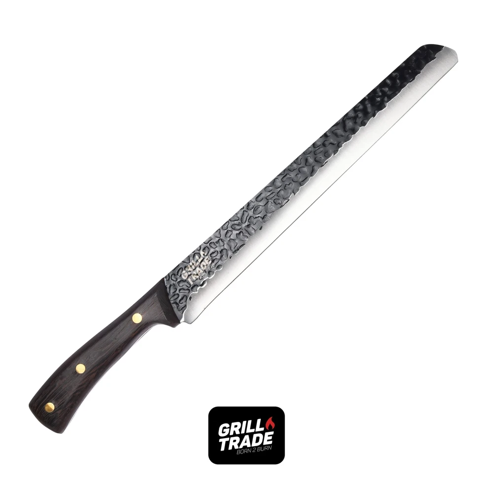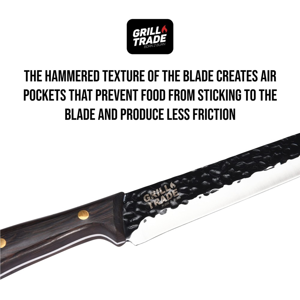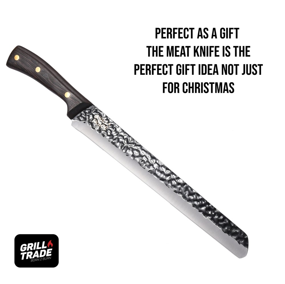 The carving knife has a hammered texture on the blade which creates air pockets. This prevents food from sticking to the blade and produces less friction. This 16-inch chef knife has an ultra-sharp blade that makes it easy to cut clean slices of meat without tearing or chipping. The comfortable handle ensures secure grip, even when your hands are wet. Steak knives have an easy and all-rounder appeal for your maximum comfort when cutting and an effective and precise cutting experience is ensured, which guarantees flawless cutting. Our elegant, ergonomic carving knife for meat is made from walnut wood and provides the best possible experience. Therefore, the knife is particularly safe and comfortable in the hand. The meat knife is the perfect gift for any special occasion. The professional chefs knife is a special gift for all knife lovers. It is the ideal tool for any kitchen. This product serves as perfect gifts for women, gifts for men, mens gits, christmas gifts for women, christmas gifts for men, christmas gifts, womens gifts