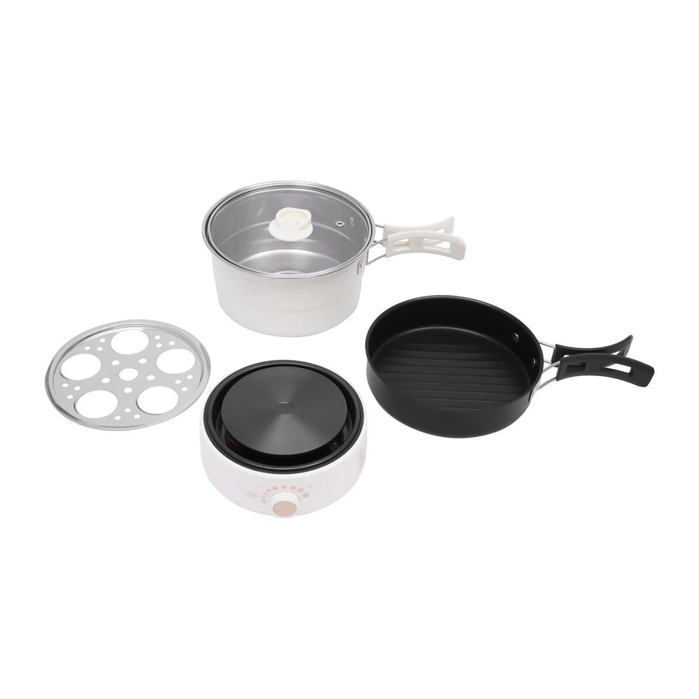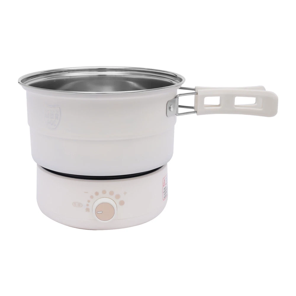 1.6L Mini Hot Pot Electric Cooker Multifunction Split 110V w/Steamer 500W Portable Electric Hot Pot with Foldable Handles, Non-stick Frying Pan, Mini Hot Pot, Multi-Functional Ramen Noodle Cooker for Pasta, Oatmeal, Soup, Steak with Power Adjustment Description Delicious food such as a sunny-side-up omelet or a tender steak is always a source of joy. Even if you are always alone, you need to take your meals seriously. This portable electric hot pot has a split design for easy storage and portability. It is also equipped with both a frying pot and a soup pot, with the multifunction of steaming, boiling, frying, and stir-frying. It can accompany you with good food to spend those times just for you alone. Key Features Multi-position Heat Adjustment: The portable electric hot pot has an 8-level temperature control function. You just need to turn the knob to set the appropriate temperature for different foods and enjoy various delicacies. High Safety: The sauce pot, frying pot, and lid are equipped with anti-scald handles, so you don't have to worry about burning your hands during cooking. In addition, it has an over-temperature dry burn automatic power-off device, which can well protect your safety when using the appliance. 360° Full Plate Heating: This product adopts a three-dimensional high-temperature heat transfer design, which makes the ingredients more evenly heated. It performs better especially in deep-fried cooking, such as frying steaks, salmon, and other meats, which can make the food look more tempting. Convenient to Clean: The frying pot features a dimpled pattern that is less likely to stick to the pot. And the inner liner of the product is coated, which makes it easier for you to complete the cleaning task. Split Design: The heating base and the pot features a split design. This is not only easier to clean but also safer to use electricity. You don't have to worry about water entering the circuit and damaging the product. And when it's not in use, you can stack the base, sauce pot, frying pot, and lid together, which is great for storage. Large Capacity: The stockpot has a large capacity of 0.42 GAL. It can hold a variety of ingredients, so you can enjoy a delicious meal for two with friends or loved ones. Stylish Appearance: The product has smooth lines and a cylindrical shape. The rounded body of the product brings a lovely feeling. It will be a unique showpiece in your kitchen. Powerful Power: The product has a high power of 500W. The powerful power can make the hot pot heat up faster, so you can enjoy food in a few minutes. Multi-functional: It is a multi-purpose cookware that can be used as a sauce pot, frying pot, or even a steamer. The two pots can be used for steaming, boiling, frying, and stir-frying. It can meet different cooking needs, so you can have multiple meals without waiting for a long time. High-quality Material: The pot body is made of food-grade 304stainless steel. It has corrosion resistance, high-temperature resistance, and healthy performance, which can effectively extend the service life of the product. Economical and Practical: The product package comes with a set of cutlery, a bamboo spatula, and two pieces of cleaning cotton. You don't need to buy extra tools to enjoy food and clean pots. Easy to Carry: The product package comes with a black storage bag, which helps you carry the product anywhere you go. Thoughtful Design: This product adopts the design of separating the pot and wire. It is not only easy to store but also can enhance the safety of using electricity. Details Multifunctional Lid: The handle of the lid can be used as a cell phone holder to free your hands, so you can catch up on TV, watch your phone, and study while you eat. The visualized lid also allows you to see the cooking status of the food more clearly, making it easier for you to master the cooking heat. Heat Dissipation Holes: The bottom of the product is configured with many heat dissipation holes, which have the performance of efficient heat dissipation and can effectively extend the service life of the product. Non-slip Silicone Feet: The product is equipped with non-slip silicone feet. It not only enhances the stability of the product but also effectively prevents the bottom of the product and the desktop from being worn. Folding Handle: It features a high-temperature resistance foldable handle, which allows you to grip more comfortably and firmly, packing away pots without stress. You can open the handle when you cook and close it after using. Application This product is suitable for single people and couples for daily meals. You can use it to cook a variety of foods such as pasta, noodles, ramen, oatmeal, and vegetables. The frying pot is excellent for frying eggs, steaks, pancakes, etc. It can meet your daily dining needs well. Specification Material: Plastic, 304 Stainless Steel, Glass Process: Coating, Plating Color: White Assembly Required: No Manipulation: Knob Type Number of People: 1-2 people Plug-in Standard: US Standard Rated Voltage: 110V Rated Power: 500W Diameter of Soup Pot: 18cm/7.09in Soup Pot Height: 12cm/4.72in Soup Pot Capacity: 1.6L/0.42 gal Frying Pot Diameter: 17.2cm/6.77in Frying Pot Height: 4cm/1.57in Base Diameter: 14.8cm/5.83in Base Height: 6.8cm/2.68in Gross Weight: 1.8kg/ 3.97 lbs Net Weight: 1.6kg/ 3.53 lbs Package Size: 22*22*16cm/ 8.66*8.66*6.3in Package Included 1 * Glass Lid 1 * Egg Steamer Rack 1 * Soup Pot 1 * Frying Pot 1 * Base 1 * Bamboo Spatula 1 * Storage Bag 1 * Power Cord 2 * Cleaning Cottons 1 Kit * Dinnerwares Notes For proper heating, check that the soup pot or frying pot is placed directly over the heating plate before heating. If not, the heating time becomes longer or it would not boil. For safety, please switch the power rods to the OFF, then cut off the power cord after cooking. Please allow the slight color difference caused by the shooting light and the 1-3 cm error due to manual measurement, and make sure you do not mi
