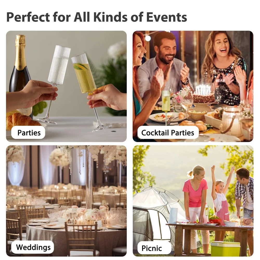 Plastic Crystal Champagne Flutes Goblet.Unlike glass and ordinary plastic on the market, our plastic champagne tall glasses are made of unbreakable high-grade plastic and completely dishwasher safe. The overall architecture combines the appearance of modern crystal tall glasses, with a glass like transparent and smooth surface on the cup body. Reinforced bases offer additional stability.This glass has a round and smooth mouth for a comfortable drinking experience. Perfect Alternative to Glasses.Plastic champagne flutes goblet avoid the embarrassing scene of glass breaking during dinner, Plastic champagne flutes will not broken like glass,no more anxious of breaking the glassware,injuring you and your family and friends,applicable for kids and adult, perfect for any outdoor and indoor environment,this is better alternative to glasses.so everyone can have a good time at the party! Perfect Gift for Anyone.You will receive Set of 16 - Modern & Elegantchampagne flutes goblet, enough for your daily and party use. You can also share them with your family, friends, colleagues, and relatives on birthdays, anniversaries, weddings, Thanksgiving, Christmas, and other occasions. Alternatively, as a unique gift to give to dad, mom, husband, wife, and friends, it will definitely leave a deep impression on important occasions. đŸ„‚ă€Elegant Goblet Champagne Plastic Cup】Made of Heavy Duty,Shatterproof,BPA-free plastic,100% food-grade ensuring that they are Durable & Sturdy. Plastic Crystal Champagne Flutes are reusable making them an eco-friendly choice for hosting events. Plastic goblet champagne glasses can be placed in the dishwasher for cleaning. đŸ„‚ă€Alternative to Glass】Plastic champagne flutes will not broken like glass,no more anxious of breaking the glassware,injuring you and your family and friends,applicable for kids and adult, perfect for any outdoor and indoor environment, It’s a better alternative to glasses. đŸ„‚ă€Worth Having】When you are at a party, exceptionally clear body and slender stem gracefully showcases your cold drink. Goblet glass suitable for various drinks, such as red wine, champagne,whisky,mimosas, sparkling cocktails and more. Add these to your wine cabinet and various parties and make a toast to your happiness! đŸ„‚ă€Perfect Gift for Anyone】A unique gift idea that is guaranteed to impress dad,mom,husband,wife,friends will love them. Celebrate life’s most memorable moments with a gift that speaks for Weddings,Anniversaries,Halloween,Christmas,Housewarming,or an engagement party. đŸ„‚ă€Tightly Packaging】Set of 16 disposable fancy 5.5oz cups,Rest assured purchase and we will escort you with your gift. To ensure safety,we use thick cardboard boxes to pack our products to ensure that the products are not easily scratched or broken.