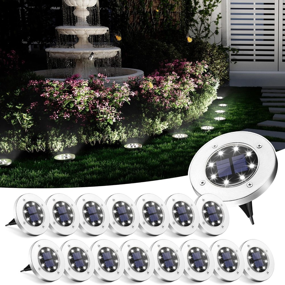 Solar Ground Lights, 16 Pack Solar Lights Outdoor Waterproof, 8 LED Solar Powered Landscape Lighting for Garden Yard Patio Pathway Driveway Walkway Cool White 【Efficient & Eco-friendly】 solar ground lights are equipped with wider polycrystalline solar panels and 8 durable LEDs, which are more efficient than other ordinary outdoor solar lights. Our ground lights use a 600 mAh nickel-hydrogen battery, which has 30% more power than other nickel-cadmium batteries, longer lifespan, and no pollution to the environment 【Automatic On & Off】The outdoor lights solar powered feature a light sensor system that automatically turns on at nightfall and off in the morning. Although charging and work time will change depending on the weather, each improved solar ground light typically illuminates for 8-10 hours after 4-6 hours of charging 【Waterproof & More Durable】Adopted IP65 grade waterproof design and silicone waterproof ring means you don’t have to worry about heavy rain, snow, frost or sleet. Split circuit board makes the chip more stable and not easy to damage. In order to prevent rust, please do not place it in a location that is easily flooded 【Wireless & Simple Installation】These solar powered outdoor lights are designed to be flush with the ground for safety and easy installation. You just need to turn on the switch and insert the stake into the ground. These solar pathway lights provide perfect lighting for your backyard, garden, walkway, patio or pathway 【Customer Service】contact me for any queries about the solar outdoor lights. We offer 24-hour technical support and assistance