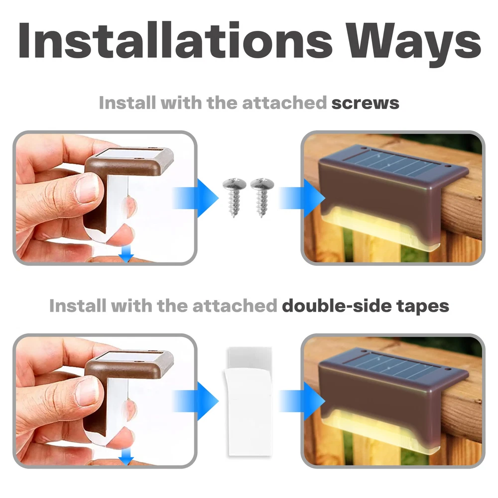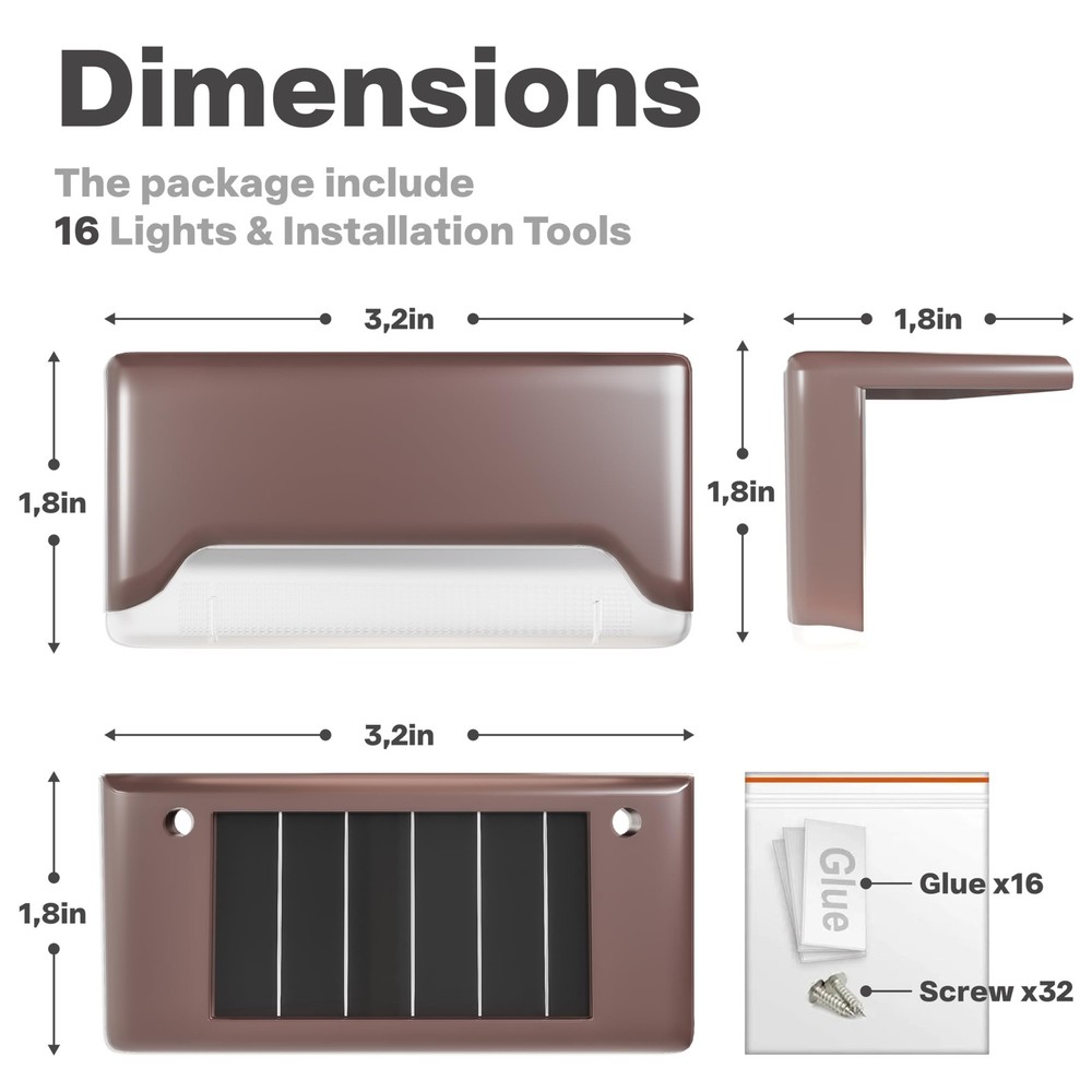 Decorative Solar Outdoor Lights. The 16-pack solar deck lights are a premium addition to any outdoor decor, offering a warm and inviting glow that enhances the aesthetic appeal of your home or garden. Designed to emit the perfect amount of warm light, they offer sufficient illumination without causing any glare. Waterproof & Durable. Constructed from durable ABS plastic, these solar outdoor lights can withstand various weather conditions and are not easily deformed by wind, snow, or rain. The solar panels have been sealed with waterproof glue, ensuring they remain functional even after severe storms. Easy Installation. Installation is effortless, requiring no wiring. The package comes with screws and tapes, allowing for easy placement vertically or along any edge of the stair, deck, fence, or steps. This ensures a hassle-free installation experience while providing a sturdy and reliable placement option for the lights. Widely Use & Multipurpose. The included screws and glues make it possible to place the lights in a variety of outdoor locations, providing a versatile option for both lighting and decoration purposes. Whether placed on stairs, steps, decks, or along outdoor walls, these solar lights effectively light up your front door, patio, yard, driveway, or other outdoor areas. Worry-Free Shopping. The package includes 16 lights, 32 screws, 16 glues, and a user manual for a hassle-free shopping experience. The solar lights provide a worry-free and cost-effective lighting solution for your outdoor space. With automatic turn-on at dusk and turn-off at dawn, they are both energy-efficient and environmentally friendly.