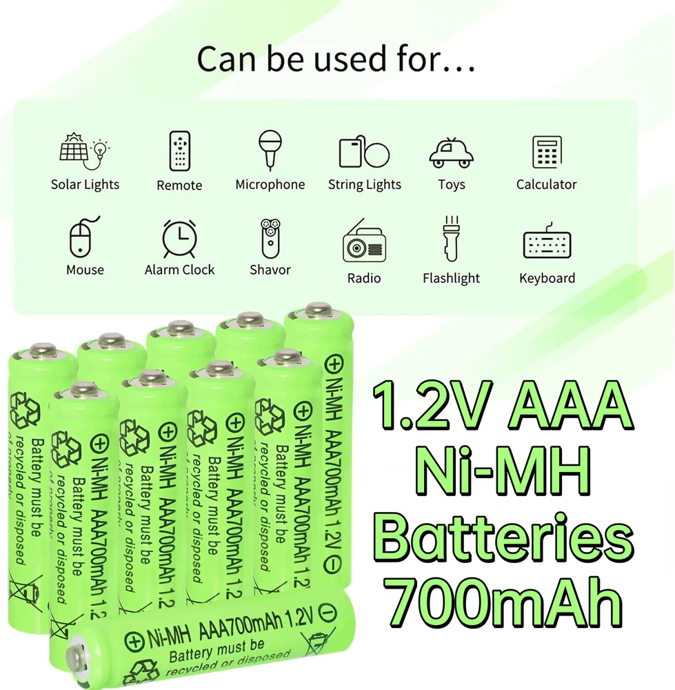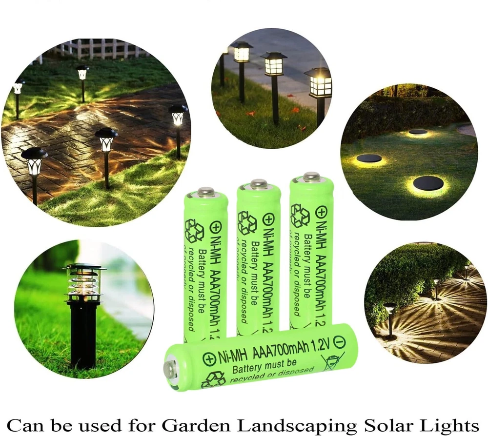 16Pcs AAA Batteries Rechargeable 1.2V 700mAh Ni-MH for Garden Solar Light US Warm Tips: Before use, please remove the plastic packaging film of the battery. Features: ❤1. Widely use: Our AAA batteries rechargeable is perfect used for solar powered garden lights, landscaping lights, lawn lights, etc. replace all alkaline disposable batteries that power your TV remotes, wireless mouse and keyboards, gaming controllers, RC remotes and others. ❤2. Easy to install and use: Remember to Keep your solar light switch on,Simply install the AAA Ni-MH batteriy in your solar lights and allow sunny day for recharging.Triple a solar batteries for outdoor solar lights can be charged via solar cell lights or standard charging units. ❤3. The 1.2v Ni-MH rechargeable batteries can be charged up to 500 times, save money from buying huge of one-time used batteries. Power life up to 25 months, longer life in the high drain devices than normal Alkaline batteries. ❤4. Please note that this is AAA size batteries---Please use up the power each time, then recharge it or it will affect its capacity and lifetime. Specification: 1.2-volt 700mAh AAA Ni-MH rechargeable batteries Voltage:1.2V Recycling above 500times Dimension: 10 Dia x 44 H mm Rapidly charging and reliable service life Ideal for fast discharge applications / solar lights Package Included: 16x 700mAh 1.2v AAA Rechargeable Batteries Ni-MH Battery Warm Tips: 1. Before use, please remove the plastic packaging film of the battery. 2. Please check the "+" and "—" directions of the battery before you charge the battery. 3. Do not put the product into fire, short circuit, dissassemble and extrude. 4. Do not mix charging with different type of batteries, which may explode or leak, causing personal injury. 5. Please use up the power each time, then recharge it otherwise it will affect its capacity and lifetime. 6. Please take out the battery if you won't use for a long time to avoid battery leakage. 7. Note:Please find us in first time when you find the parcel Broken/Scratch/Function Error/Miss Parts/Unwork/has not arrived etc, we always have more details and solutions, even duty for your order. On Jan 8, 2025 at 19:16:19 PST, seller added the following information: