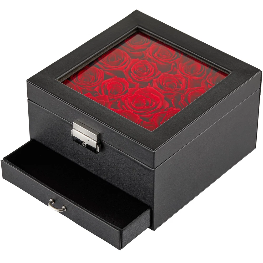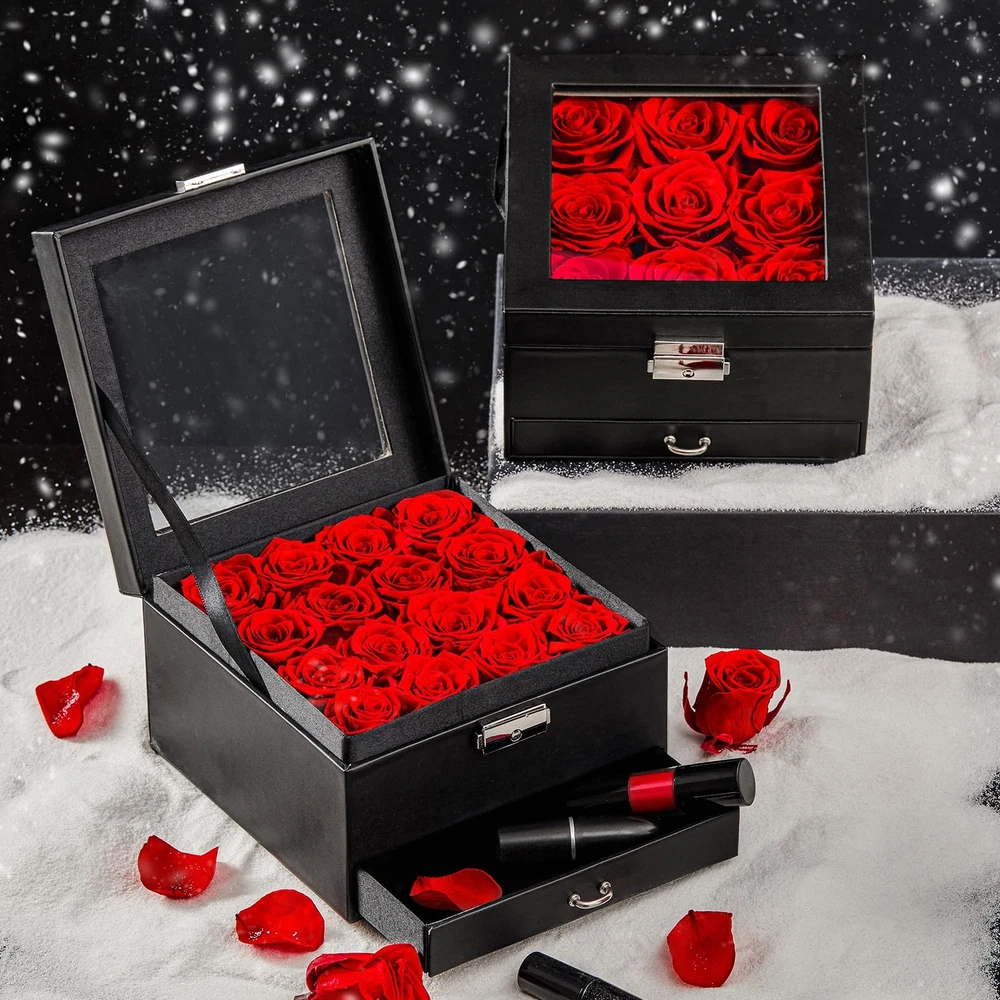 Our preserved roses are made up of fresh and real flower, which undergo an intricate process to preserve the quality and integrity of the petals which are then dyed with rich and bright colors. It can last for 3-5 years. This rose box can offer an elegant, luxurious way to create lasting moments with the people you cherish most. Not just once, but every day and all year. The black box is made a of high quality PU leather with a transparent film covering, making it easy to enjoy the eternal roses. Each box contains 16 eternal roses which make the whole rose box fuller and extremely more eye catching. There is a convenient pull-out drawer that can be used to store jewelry and other smaller precious items. This long lasting rose box is a last forever keepsake gift for Valentine's Day Birthday Mother's Day Marriage proposals Weddings Anniversaries Christmas. It can be a perfect fit for your girlfriend, mom or significant other. Our preserved roses hold tenderness and a natural and fresh look, with no maintenance required. No need to water or add sunlight.