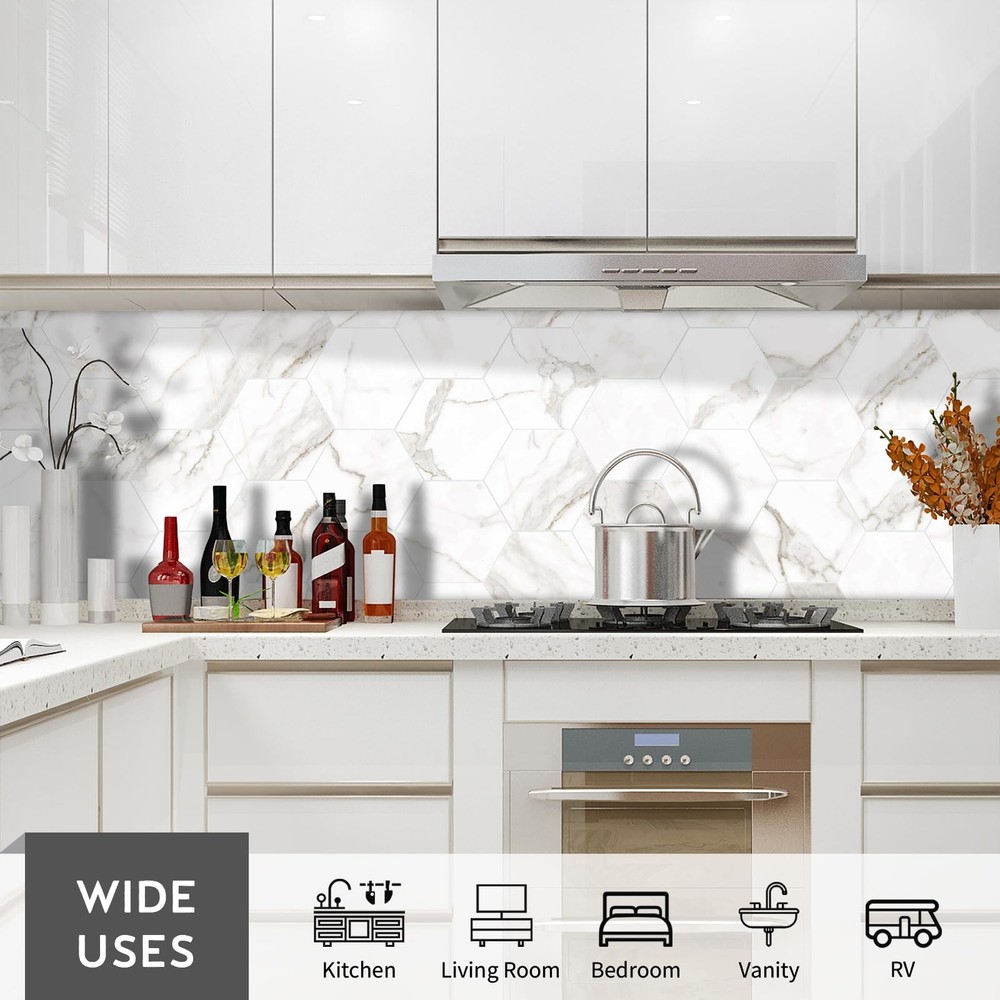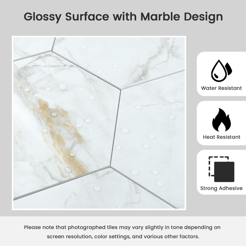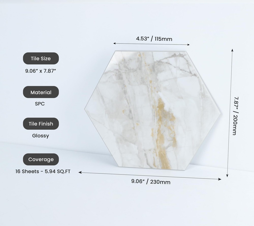 Size & Package: Each pack includes 16 hexagonal tiles (9.06" x 7.87" each),covering about 5.94sq.ft. Mix and match patterns or extend your design with multiple packs for a personalized kitchen backsplash, bathroom accent wall, or fireplace surround. We always recommend taking 5~10% more for installation losses concern. SPC Realistic Marble Texture: Crafted from SPC with a rigid core, these hexagon tiles combine durability and elegance. Ultra-HD 3D printing mimics natural marble veins, while the textured surface resists scratches and stains for long-lasting beauty. Easy Peel & Stick Installation: Self-adhesive backing allows quick installation without grout or glue—perfect for small areas! For large projects, use heavy-duty cutter or chop saw to split tiles along pre-scored lines. (Note: Professional tools recommended for precise cuts). Premium Features: Waterproof, oil-proof and heat resistant make it super fit for kitchen. Can be used behind the stove. Stronger backing glue and thicker version make it better than ordinary vinyl tile sticker, more durable than plastic self-adhesive tiles. Versatile Use - Our hexagon mosaic tiles are perfect for numerous applications. Ideal for kitchen, bathroom and laundry room. Their versatility extends to RVs, making them a top choice for homeowner and DIY enthusiasts.