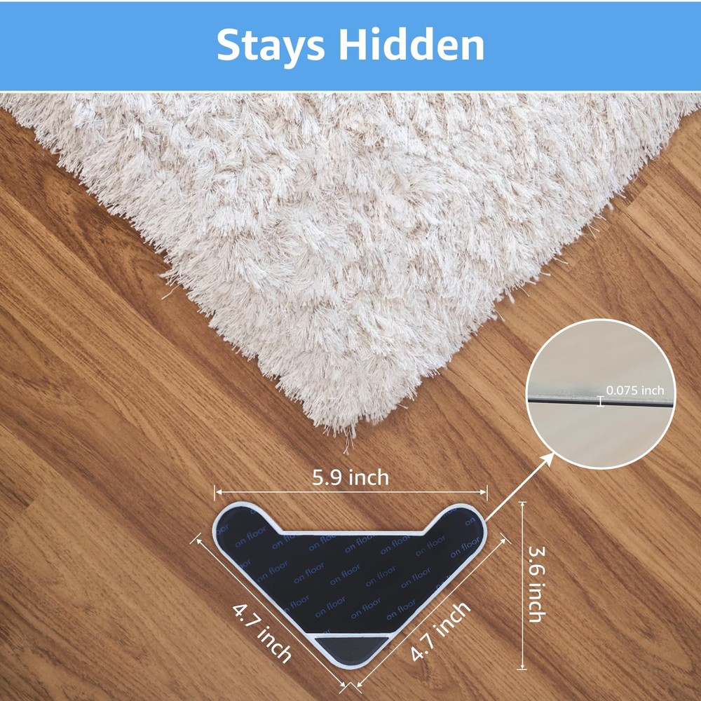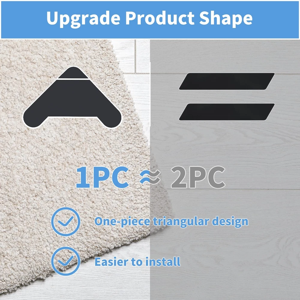 Grippers for Rugs, Non Slip Dual Sided Rug Pads Grippers for Hardwood Floors and Tiles, Reusable Washable Adhesive Carpet Rug Tape for Area Rugs (Rectangular) πŸ‘[NON SLIP TRIANGLE GRIPPERS] Our grippers for rugs adopts triangle design,which is more stable, lightweight, invisible, and has strong fixation. Our anti slip pad can fit your carpet corner perfectly and will keep rugs in place and prevent them from curling, sliding, folding and pet moving. πŸ‘[STRONG ADHESION] Our grippers for rug with dual sided design will not leave dirty stuff and residue of the paste on your floor. These carpet tape can increase area, provide excellent adhesion and grip, and prevent the corners and edges of the carpet from curling. πŸ‘[REUASABLE] Unlike other cheap disposable non-slip rug stoppers, our grippers for rug can be wiped with clean water or soapy water and then reapplying once dry again.Buy once, use multiple times! πŸ‘[EASY TO INSTALL]Just remove the stickers from the rug tape and put the "Rug side" of the product to rug corner, then press the "Floor side" firmly onto the hardwood floor. Also the anti curling gripper for rug is less than 1/10 inch thick which can stay hidden while daily using. πŸ‘[MULTI APPLICATION] Our Rug tape fits most types of floor: hardwood floors, tile floors, laminate, marble, concrete,etc. Various pack for choosing which can meet your different needs!