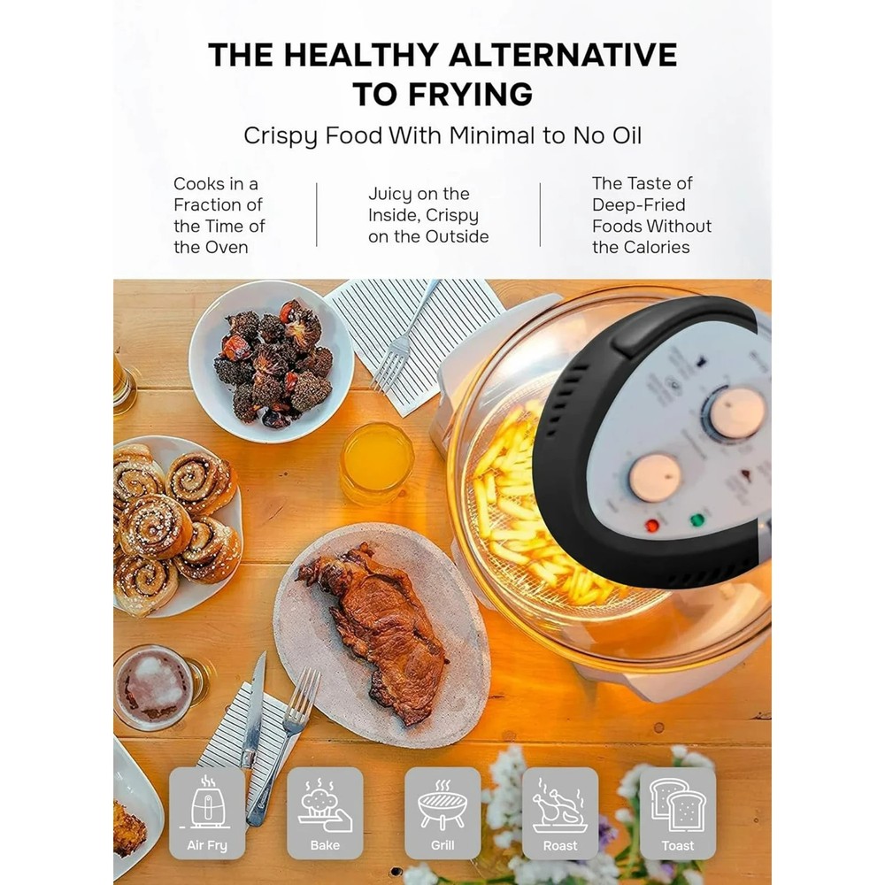 Product details Discover the GraniteStone 16Qt Air Fryer Oven, your all-in-one solution for healthier cooking in a stylish black finish. This versatile air fryer doubles as a toaster oven and combines halogen, convection, and infrared technology, ensuring food is cooked perfectly crispy on the outside while remaining juicy inside—without the need for added fats or oils. Its 1300W power enables quick and even cooking, eliminating the need for pre-heating. From roasting turkey, baking fish, and grilling meats, to air frying crispy chicken, this cooker does it all. See your food cook with ease through the transparent glass bowl, making adjustments simple without losing heat. Perfect for any kitchen, its elegant copper color enhances your decor while it simplifies meal preparation and ensures delicious results. Oil-Free Frying for a Healthier Crunch : Enjoy the crispy texture you love with little to no oil! The GraniteStone airfryer uses powerful 360° convection heat to deliver that deep-fried taste, while the dual-bowl design keeps excess fat and oil away from your food. All-in-One Powerhouse : More than just an air fryer! With a wide temperature range of 180F to 400F, the GraniteStone non toxic air fryer oven lets you air fry, bake, roast, grill, and toast, all in one versatile appliance. Crafted with your health in mind, this air fryer is 100% free of Teflon and forever chemicals, so you can cook confidently without exposure to harmful non-stick coatings. Hassle Free Auto Clean Function : Say goodbye to messy cleanups! The built-in auto clean function takes care of the hard work, and the removable parts are dishwasher safe for even more convenience. Extra Large 16 Quart Capacity : Cook for the whole family with ease! The spacious interior fits multiple dishes at once, features a nonstick surface for easy cleanup, and includes 3 cooking levels. Cook Like a Pro Every Time : The GraniteStone Oil-Less Air Fryer features easy-to-use time and temperature controls, letting you dial in perfect settings for everything from meats and seafood to crispy vegetables.