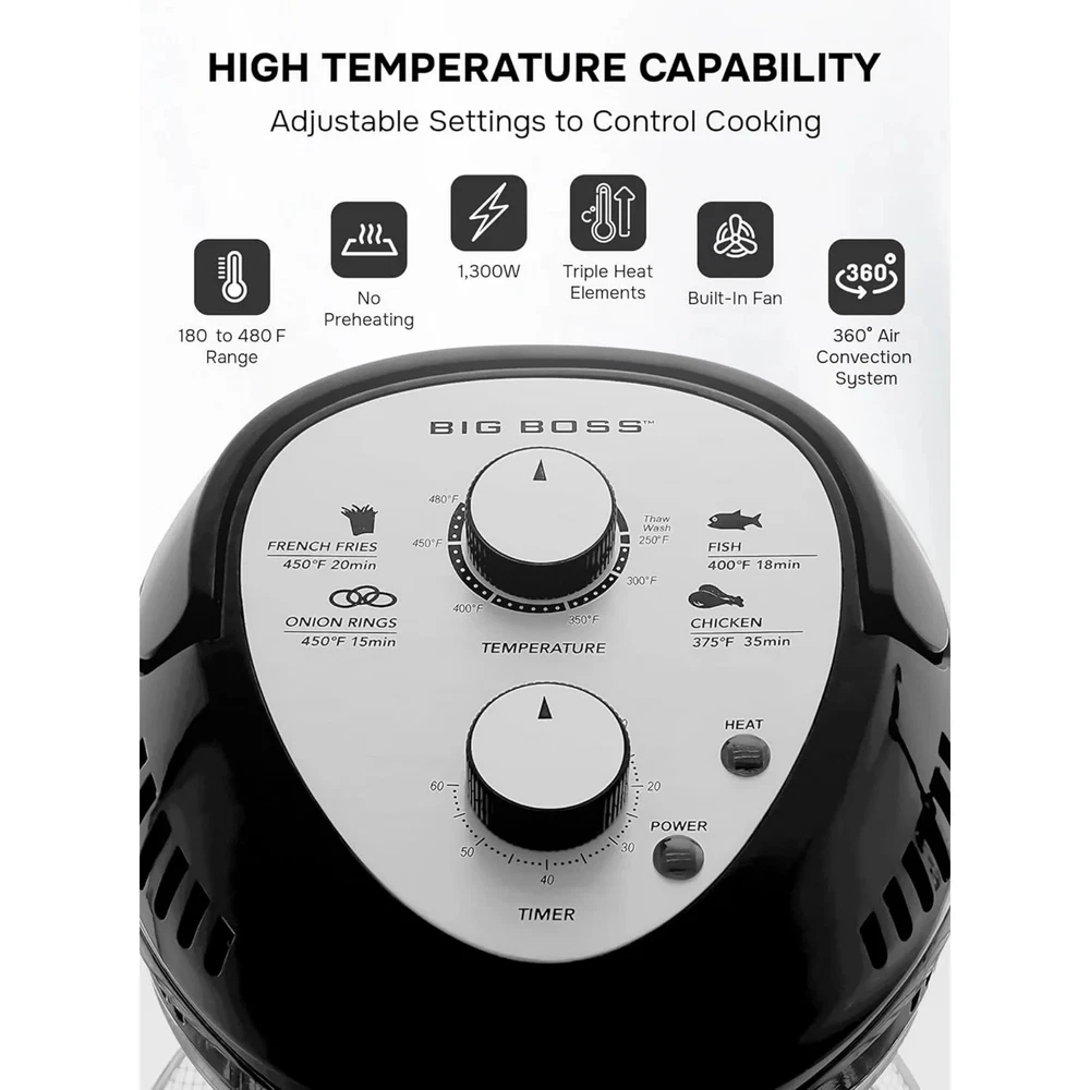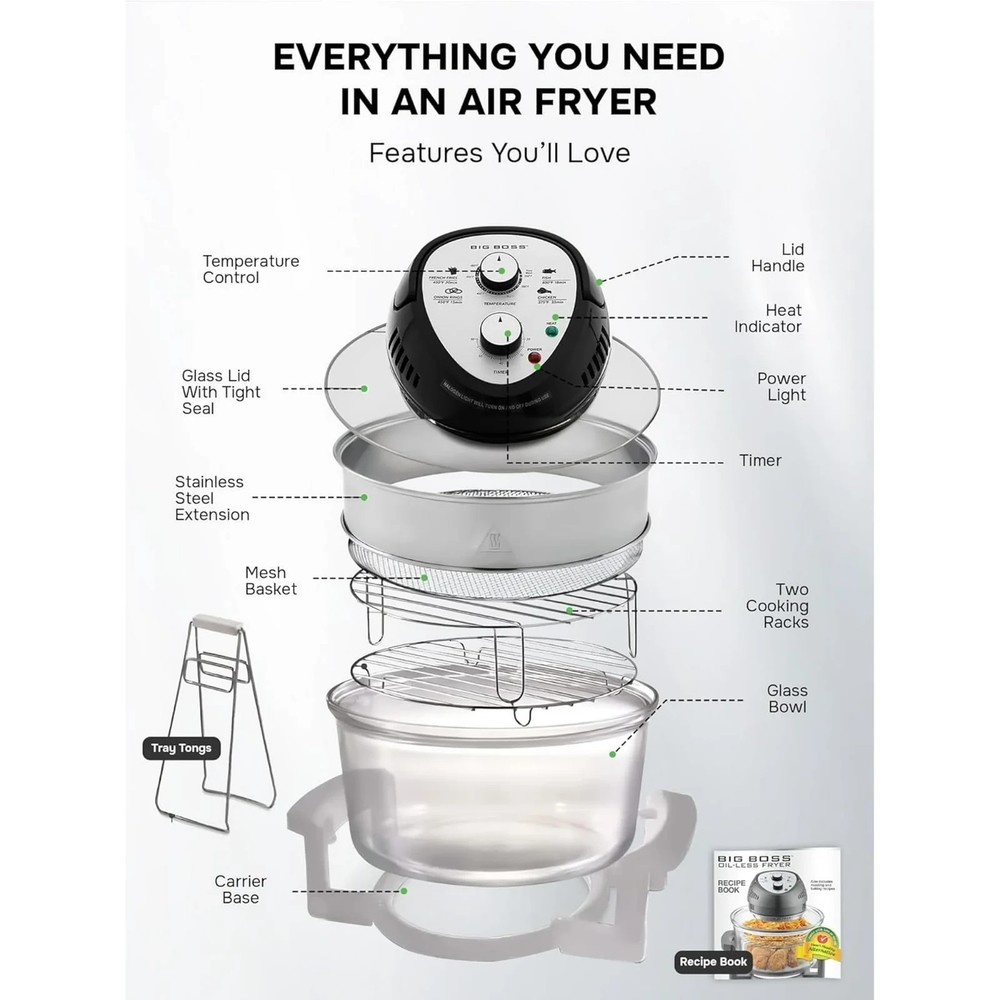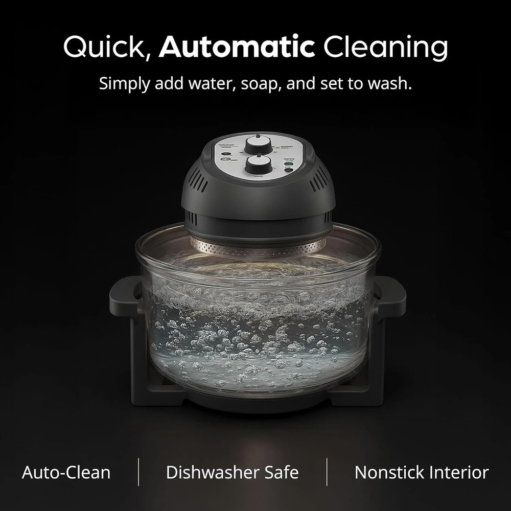 Product details Discover the GraniteStone 16Qt Air Fryer Oven, your all-in-one solution for healthier cooking in a stylish black finish. This versatile air fryer doubles as a toaster oven and combines halogen, convection, and infrared technology, ensuring food is cooked perfectly crispy on the outside while remaining juicy inside—without the need for added fats or oils. Its 1300W power enables quick and even cooking, eliminating the need for pre-heating. From roasting turkey, baking fish, and grilling meats, to air frying crispy chicken, this cooker does it all. See your food cook with ease through the transparent glass bowl, making adjustments simple without losing heat. Perfect for any kitchen, its elegant copper color enhances your decor while it simplifies meal preparation and ensures delicious results. Oil-Free Frying for a Healthier Crunch : Enjoy the crispy texture you love with little to no oil! The GraniteStone airfryer uses powerful 360° convection heat to deliver that deep-fried taste, while the dual-bowl design keeps excess fat and oil away from your food. All-in-One Powerhouse : More than just an air fryer! With a wide temperature range of 180F to 400F, the GraniteStone non toxic air fryer oven lets you air fry, bake, roast, grill, and toast, all in one versatile appliance. Crafted with your health in mind, this air fryer is 100% free of Teflon and forever chemicals, so you can cook confidently without exposure to harmful non-stick coatings. Hassle Free Auto Clean Function: Say goodbye to messy cleanups! The built-in auto clean function takes care of the hard work, and the removable parts are dishwasher safe for even more convenience. Extra Large 16 Quart Capacity: Cook for the whole family with ease! The spacious interior fits multiple dishes at once, features a nonstick surface for easy cleanup, and includes 3 cooking levels. Cook Like a Pro Every Time : The GraniteStone Oil-Less Air Fryer features easy-to-use time and temperature controls, letting you dial in perfect settings for everything from meats and seafood to crispy vegetables.