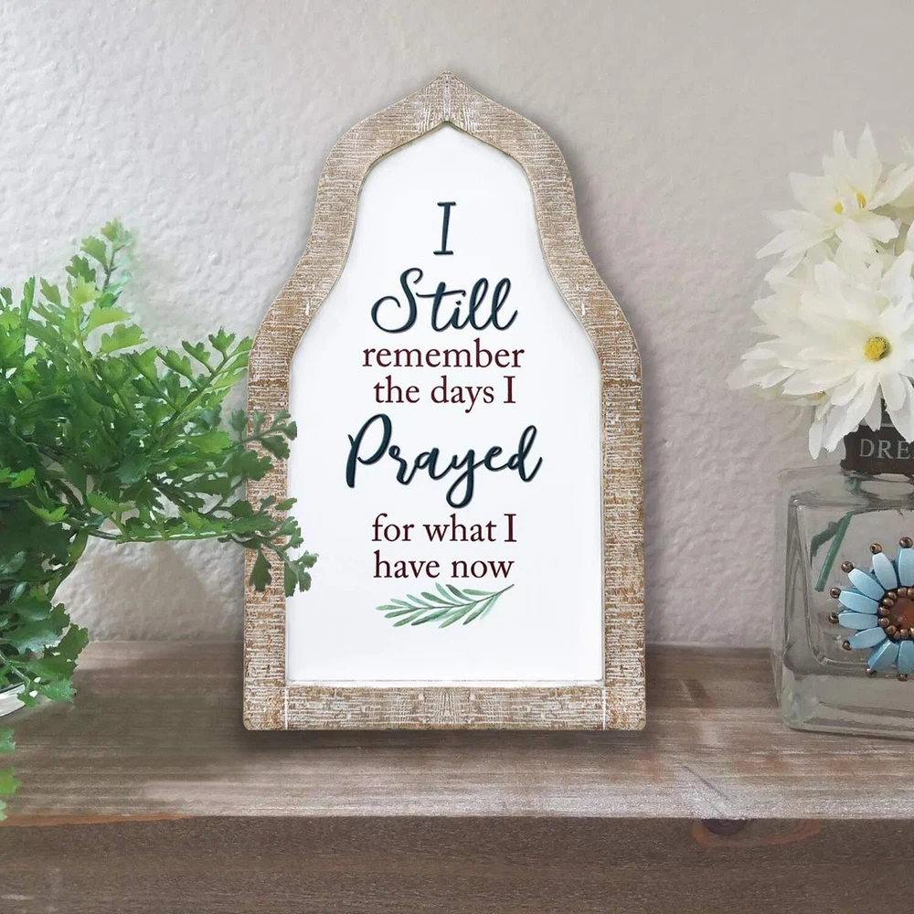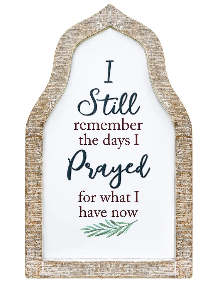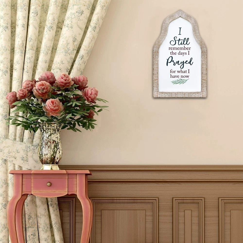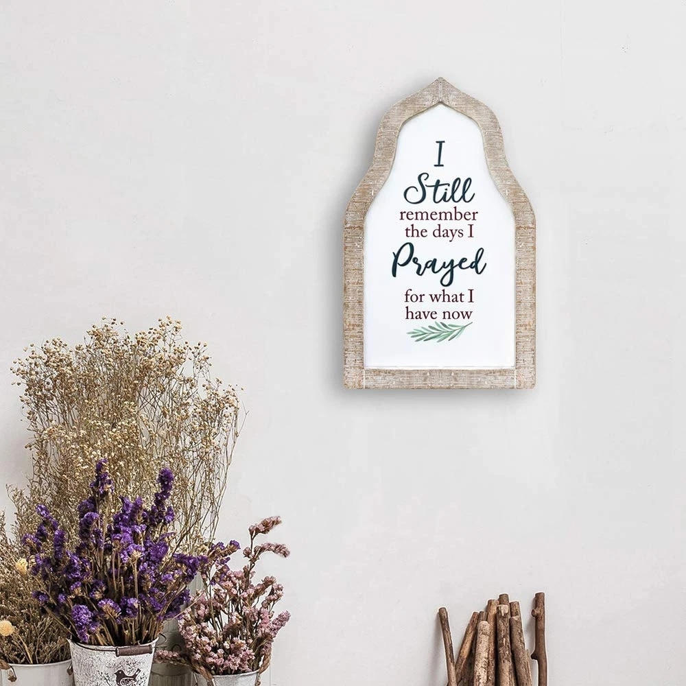 16"X10" Church Shape Prayed Sign Wall Decor, Rustic Farmhouse Wood Framed Metal Plaque House Prayer Sign for Christian Home Decor Wall Art - I Still Remember The Days I Prayed for What I Have Now Product Details Color: white, brown Brand: DeliDecor Material: Wood Theme: Rustic,Farmhouse Recommended Uses For Product: [INF] Wall decor, home decoration, prayer room decoration Mounting Type: Wall Mount Product Dimensions: 16"L x 10"W Shape: Rectangular Style: Modern Pre-printed: I Still Remember The Days I Prayed for What I Have Now Item Thickness: 0.4 Inches UPC: 656874682219 Item Weight: 1.12 pounds Manufacturer: DeliDecor Batteries required: No The prayer sign with shape of church makes you feeling in the church when pray, and make your prayer more pious. With our prayed signs, let your repose of heart set deep in God. Impress your guests, friends and family with this farmhouse signs decor; a unique statement piece for living room, bedroom, dining room, kitchen decor, or any other home decoration. This wall decor is ready to hang on wall with a sawtooth hanger, or lean against any mantles or tabletop, But CAN NOT BE FREE STANDING. It is also an indispensable special decoration for the prayer room. Quality and sturdy construction of solid wood frame with metal backboard, which will not crack, rot, or break; Measures 10''Wx0.4''Dx16''H. The perfect gift that is cute and affordable; Signs can be used as a clever gift idea and great for people of all ages; Perfect for a housewarming, holiday or any occasion gift.