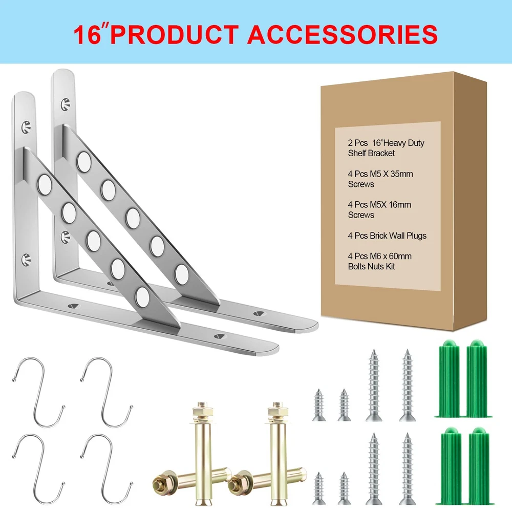 Installation steps: 1. Drill (6cm) and use the brush to clean the dirt in the hole. 2. Hammer the wall anchor into the hole. 3. Align the holes in the shelf bracket with the holes in the wall, screw in the long screws to fix the bracket. 4. Insert the wooden shelf using the screw tool from bottom to top screw in the short screws into the wooden board. Shelf Bracket Package List: 2 shelf brackets, size - 15.75" x 9.84" 4x S-hooks 4x plastic plugs 4x (4*16mm) self-drilling screws 6x (6*35mm) self-tapping screws 4x M6x60mm Bolts Nuts Kit STURDY : Made of high-quality stainless steel with brushed surface and smooth machined edges, with solid triangular structure and 3mm thick support rod, it is strong, wear-resistant and dur-able. Use up to 440 lbs/ 180 kg, not easy to rust or break. FLOATING SHELF BRACKET: The shelf bracket is made of L-shaped supports, welded by high-strength stainless steel, and there is no need to worry about the welding accessories falling off. 2 welding points on each side, enough to support more weight. EASY TO INSTALL: We come with mounting accessories, expansion tubes and long screws for fixing the longer bracket arm to the wall, and short screws for fixing the other bracket arm to the wood board. SUITABLE FOR MANY DIY USES: Our shelf brackets are sturdy and dur-able with a beautiful appearance. Can meet your various ideas for home improvement, such as bookshelves, kitchen racks, display racks, garden racks, garage workbenches, exterior wall brackets and more storage rack items. Also great for office, , hotel or commercial use SHELF BRACKET PACKAGE LIST: 2 shelf brackets, size - 15.75" x 9.84",4x S-hooks,4x plastic plugs,4x (4*16mm) self-drilling screws,6x (6*35mm) self-tapping screws,4x M6x60mm Bolts Nuts Kit. Our heavy-duty brackets provide a 24-month quality , and if you are not satisfied within 30 days, we can provide you with a or service, and 24-hour manual service is available online for you.