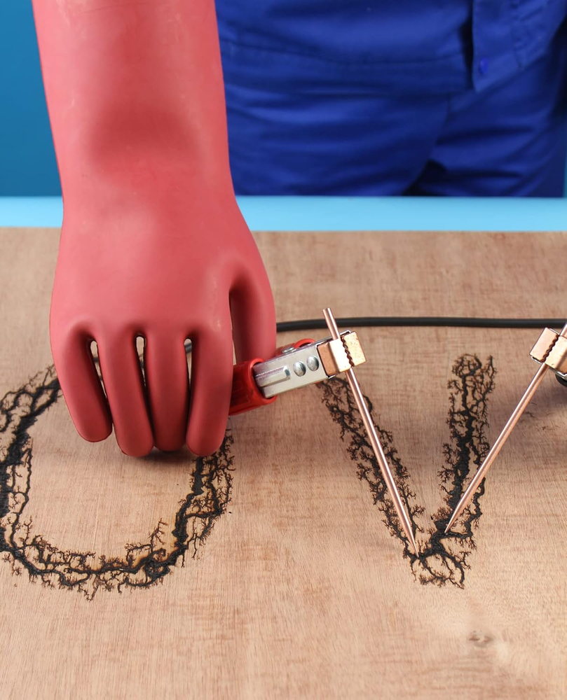 Product Description Flexible, thick, Not for dexterous work. Leather protectors which not included in our gloves recommended to be worn over rubber gloves for protection. Gloves Used for Lichtenberg Wood Burn Output 15kVAC 40mA Designed and manufactured according to China national standard GB/T 17622-2008. Each pair of gloves, whether used or in storage should be visually inspected and/or electrically tested. China national standard recommends a periodic inspection, electric retesting or periodic replacement. No gloves should be used unless they have been tested within a maximum period of 12 months when in storage and 6 months when in use. Testing includes air inflation to check for air leaks, a visual inspection while pressurized, and then a dielectric test in accordance with GB/T 17622-2008. If the glove is thought to be unsafe, the pair shall not be used, then electrical test or destroyed. Avoid contact with any substance that could affect the glove integrity. Gloves that are soiled in use should be washed with soap and water. Gloves that become wet from washing should be dried thoroughly at a temperature not above 65 °C. Do not compress or fold the gloves. Keep away from direct heat, radiators or other sources of artificial heat, direct sunlight, artificial light or other sources of ozone. Store in temperatures between 10°C and 35°C. This product contains natural rubber latex which may cause allergic reactions. Insulating gloves are recommended to be used in conjunction with leather protector gloves to provide mechanical protection on its natural shape. What are in the package: 1 Pair(1 right + 1 left) rubber electrical insulated gloves and 1 English and Spain Manual.(Leather protectors are not included in our gloves.) Colour: Red, Materials: Rubber, Thickness: 1.8mm Product Weight: 16.1oz Package Weight: 17oz Individual Glove Size: XLarge, 15x6.7x2.4 inch Package Size: 15.1x6.8x2.5 inch Max Use Voltage: 16kVAC/26kVDC Instructions Version: English and Spain First Tested Date: Same as Mfd. date on the instructions. Mfg. Standards: China National Standard GB/T 17622-2008 Used for Bare Hands Size: 10 inch hand circumference (just below the knuckles, not including thumb.)
