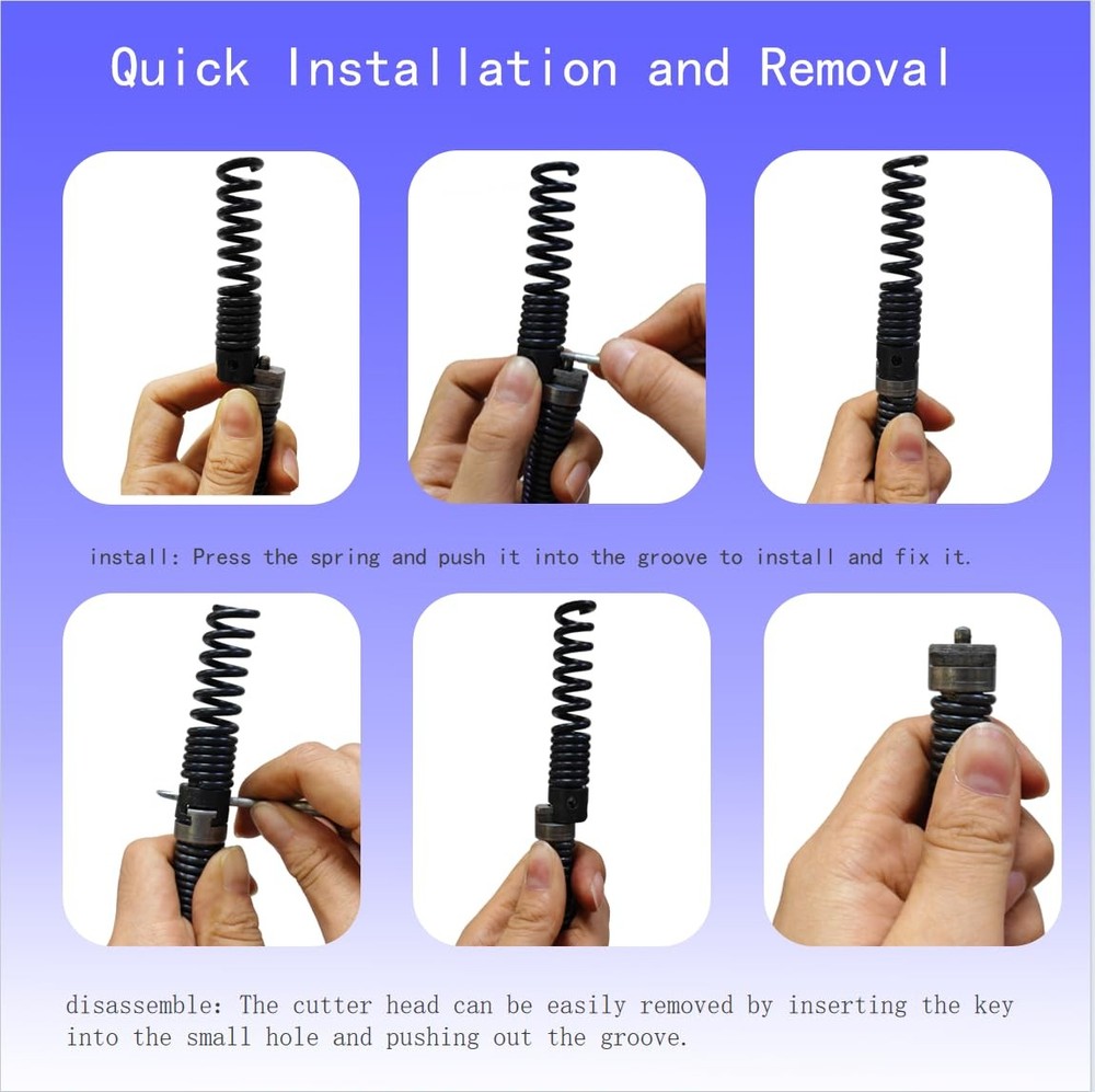 The set has a complete range of categories and focuses on solving various clogging problems. 【Function】Suitable for sewer snake drain cleaning cable with a diameter of 16mm(0.62in), cleaning various blockages such as tree roots, branches, hair, etc., breaking various greases and hard objects, and effectively expanding and clearing pipes. 【Applicability】Suitable for various brands of pipe dredging machines, plumbing snake and drainage pipe drilling machine .Can be used on various interior plumbing or septic systems, it is a good tool for regular cleaning of septic tank systems or internal pipes. 【High quality】The cutting head set is made of a heavy metal material for durability .The surface has been treated with anti-rust and the welding is firm,not easy to deform and wear-resistant, and the unique shape helps to grab or cut off things that are in the way. 【Easy and Quick Installation and Removal】 Press the spring and push it into the groove to install and fix it. The cutter head can be easily removed by inserting the key into the small hole and pushing out the groove. 【Service】Package includes 6 types *cutting head ,1*electric drill converter ,1*key. In order to protect the cutter head, a little oil is applied on the surface, please don't mind.One-year warranty, please feel free to contact us if you have any questions.