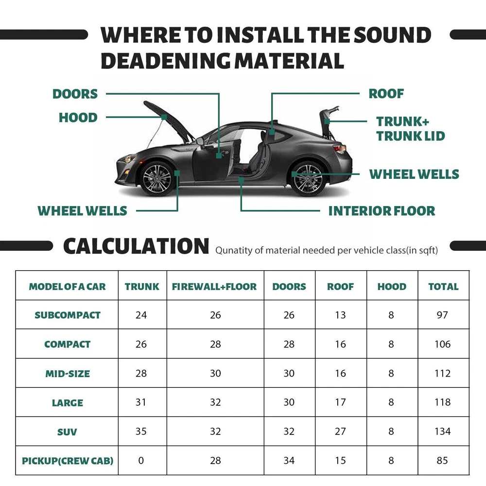 Package included: 15pcs 16" X 10" Car Sound Deadener Heat Insulation Pads Description: Type:Car Truck Noise Reduce Dampening Material: Aluminum & Foam Thickness:7mm Size:40x25cm=16"X10"=16.15sqft=1.5sqm Color: Silver+Black Recommended Install Temperature: -10°C ~ +60°C Resistance Temperature Range: -40°C ~ +300°C Waterproof : Yes Features Qiaobali Best choice of motor parts 16sqft Car Sound Deadener Heat Insulation Mat Hood Floor Door 15pcs 40cmx25cm Package included: 15pcs 16" X 10" Car Sound Deadener Heat Insulation Pads Description: Type : Car Truck Noise Reduce Dampening Material: Aluminum & Foam Thickness:7mm Size:40x25cm=16"X10"=16.15sqft=1.5sqm Color: Silver+Black Recommended Install Temperature: -10°C ~ +60°C Resistance Temperature Range: -40°C ~ +300°C Waterproof : Yes Features 【 Reduce road noise 】If you often drive on uneven roads or on noisy highways, sound insulation can bring you more comfort. It will reduce the noise of roads and other drivers. It will make your driving smoother and have the added benefit of better media listening 【 Enhance the music 】Use sound insulation to make your radio clearer. You will no longer have to turn it up because of traffic noise. Not only is it good for music, but audio books and telephones will sound better, too 【 Improve privacy 】If you don't want other people on the road to hear what you're listening to, the sound insulation prevents the noise from escaping. Sound insulation will help you 【 Warm in winter and cool in summer 】The car insulation will help reduce your interior temperature in the summer, and in winter, the heat insulation can keep you warm in the car, which is conducive to warmth reduce engine/tunnel/console 【 Protect car paint 】In summer, the temperature is too high, the engine runs at high speed and accelerates for a long time, and generates heat, which can easily cause the aging and fading of the car paint; the heat insulation pad can protect it 【 Increase the life of the car 】In summer, due to high temperature and long-term driving, it is easy to cause the cabin to heat up and cause a fire, which may seriously damage your car. Using heat insulation pads can extend the life of the car Installation: Decide what part you want to insulate first: car roof, car floor, car doors or a hood. Please clean the surface you want to paste. Remove the remains of the factory insulation once you have dismantled the interior. Properly clean and degrease the surface prior to installation of mat. Measure the pre cleaned surface of the prospective spot that you are going to treat. Try to locate the piece of material onto the prospective surface of a car without removing an adhesive paper. When your sheet is ready to used, lay that down to the surface and let is glue. Flatten the sheet with hands to avoid air bubbles. Use a roller(not including) for rolling down the foil as a neat step. ? Installation Notices: Make insulation materials and sheet metal firm fit, and play best adhesive, damping performance Do not cover the chassis wiring or air holes when you installation Appropriate use of adhesive tape will strengthen connections effect Paste Aluminum Soundproof/Damping Plate,you could heat with a hair dryer to make it soft, then compacted by hand. If the room temperature is below 5 degrees Celsius, first with sun lamp heating it until soft. Then remove the wax paper and paste it. The extra insulation can be pasted in some hidden place It is not possible that there is an effect on the hearing by only a door installation ,it requires completed construction ? Fitment For: Exterior bulkhead, firewall, hood, engine compartment, engine bays. Boot, wheel arch, body panels, load floor, under seat, floor, interior bulkhead And So On. Also ideal for under floor applications as it has great load resistance properties. Note: Due to the light and screen setting difference, the item's color may be slightly different from the pictures. Please allow slight deviation for the measurement data. Please allow 1-3cm error due to the hand measurement . If you have any questions, please contact us at the first time, we will give you a satisfactory answer. Item Specifics Brand Modigt Type Car Truck Noise Reduce Dampening Color Silver&Black Manufacturer Warranty 2 Years Material Aluminum & Foam Placement on Vehicle Cargo/Trunk/Bonnet/Dashboard/Under Seat/Doors Fitment Type Direct Replacement Manufacturer Part Number Car Heat / Sound Insulaiton Deadener Superseded Part Number Deadening Material Insulation Cars & Truck Application 1 Hood,Firewall,Doors,Floor,Roof Application 2 Underlay,Boot,Panel,Chasis Application 3 Trunk Lid,Trunk Room,Engines,Tailgate Application 4 Ceiling,underneath bonnets,Underfelt Application 5 Car& Home Interior Heat Sound Deadener Insulation Application 6 Automotive,Motorhome,Camper,Restorer Application 7 Classic Car,Race Car,Stock Car,Old Vintage Car,Pickup,SUV,Caravan Application 8 Van,Truck,limousine,Camper,Boat,Motor Homes,School Bus,Low Rider Application 9 muscle car/hot rods/corvettes/imports/tuners/street rods/rat rods Application 10 For use in the application of any sound deadening Function 1 Reduce the road/ Engine/ Wind noise Function 2 Dustproof/ Waterproof/ Anti-moisture Function 3 Protects Paint from Blistering Easy Installation All Curves and Corners Without The Need For Heat Features1 Easy Installation, Waterproofing, Noise Reduction Features2 Protects Paint from Blistering, Anti-moisture Features3 Easy Clean,Noise Reduction, Easy to Cut, Self-Adhesive Thickness 7mm=276mil=0.276” Size 40X25cm/ 16inX10in Items Included 15pcs 16" X 10" Car Sound Deadener Heat Insulation Pads Payment 1. It will be much appreciated that you finish your payment asap or it will make UPI (unpaid item case) on your account leading to be suspended or restricted by eBay when those UPI cases carry over to certain amount. 2. Any problems please contact us for more details. Shipping 1. All items will be shipped to buyer's eb