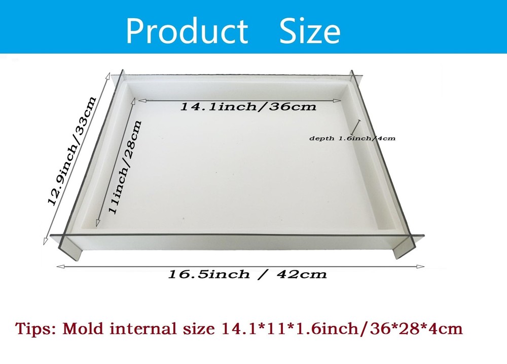 Large Table Resin Silicone Mold: You will get a rectangular deep tray resin large mold and fixing frame. Frame size: 16 * 12 inches, silicone resin mold inner size: 14.1 * 11 * 1.6 inches. The edges of the large pallet resin mold are upgraded and reinforced to prevent warping. Suitable for DIY unique resin crafts, large thickness trays, River coffee table, cutting boards, serving trays, cheese platter, home decorations. Durable Silicone Material: The molds are made of durable silicone material with high tear strength, easy to use and clean, with epoxy and casting resins. Glossy Molds for Resin Casting: These molds have a glossy inner surface, the smooth interior makes it easy to de-mold after it’s completely cured, and reduces the need for cutting and polishing Suitable for a variety of materials: You can add various pigment powders, resin dyes, to color the transparent resin,you can also add some dried flowers, glitter, rhinestones, beads and other fillers Warm Tips: Make sure the bottom of the mold is flat before use, reinforce the mold with a frame (the frame is inside the product box), and use epoxy for layered pouring if necessary.