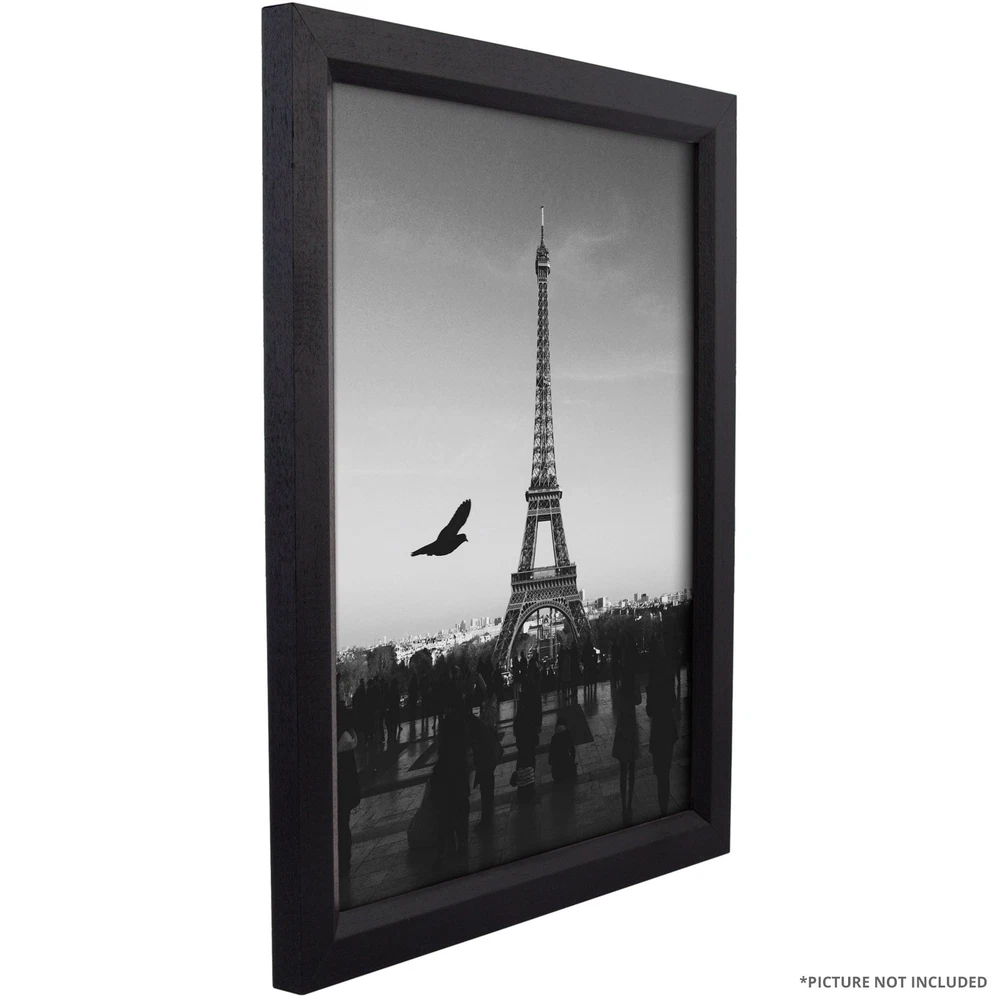 Traditional style; black; wood grain finish Frame includes: clear acrylic facing, rigid cardboard backing and wire hanging hardware kit (some assembly required) Frame holds a 16 inch by 22 inch photo/print/poster (viewable area is slightly smaller) Frame moulding is .825 inch wide; solid wood Made in the U.S.A.