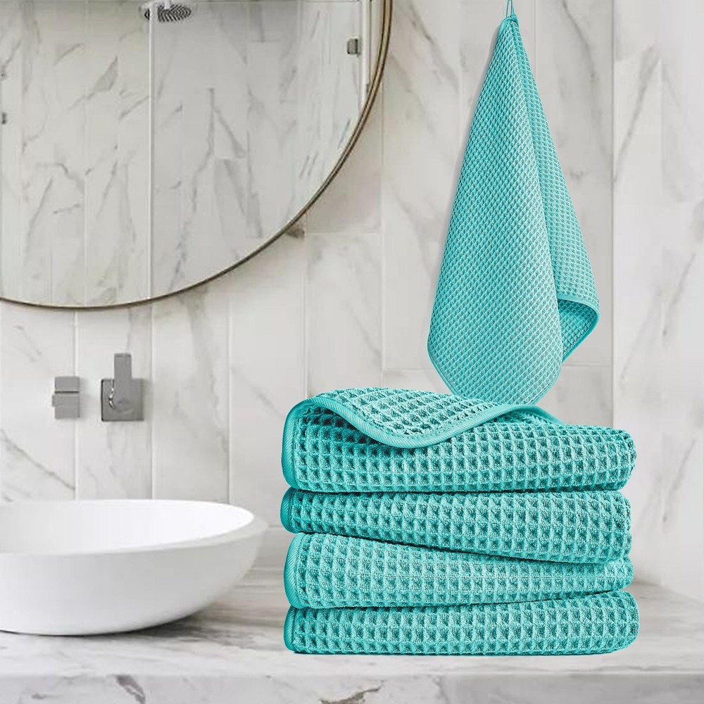 Absolutely love these waffle weave towels! They’re incredibly soft and absorbent, drying hands and faces in no time while staying lightweight. The quick-dry feature keeps them fresh, and they hold up well after multiple washes. Perfect for kitchens, bathrooms, or even on-the-go—just toss them in the machine for easy care. The aqua color is vibrant, and the 4-pack ensures you always have a clean one handy. Highly recommend for anyone who wants quality without the bulk!