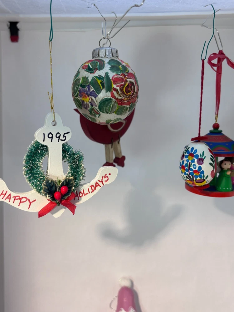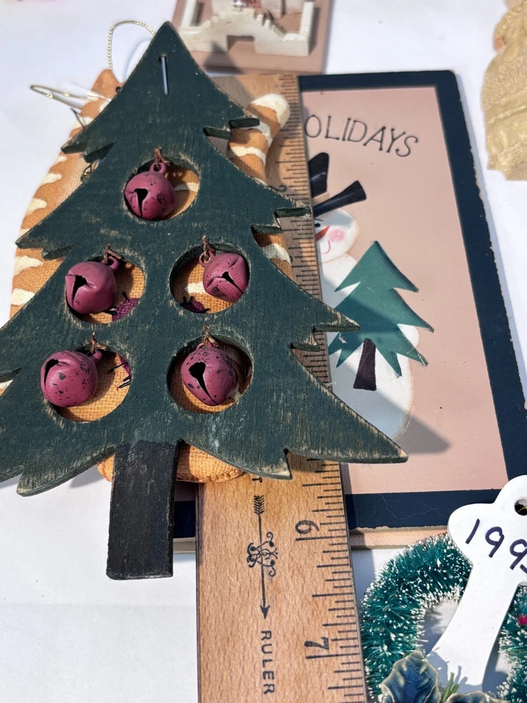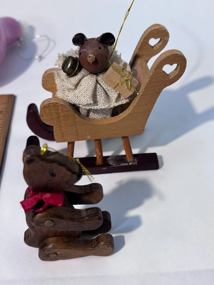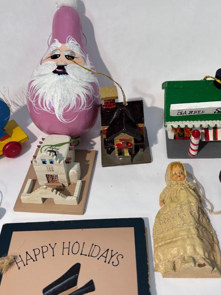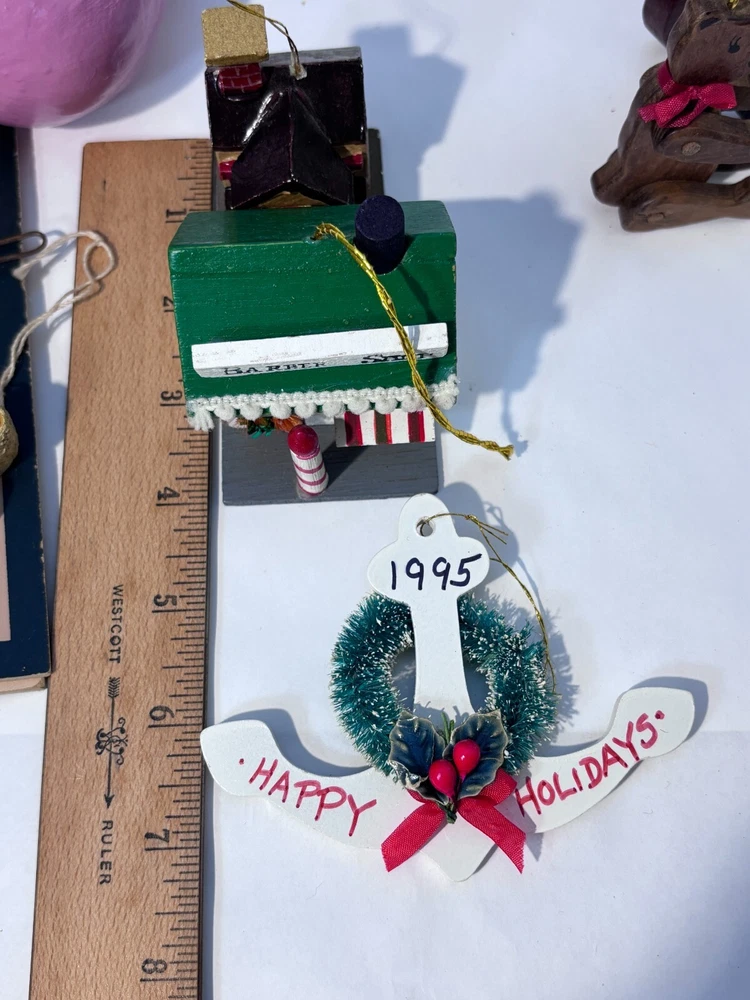 17 Assorted Wooden Christmas Ornaments Bears Trees Birds Hand Painted Carousel The set includes a yellow cat, a card "Happy Holidays", a Tree with bells, a bear with articulating arms and legs, a doll, a house, an elephant on a cart with wheels, A Santa , a house, a barber shop, a bear in a carriage, a penguin, a carousel with carolers, an egg, a red bird, a hand painted ball, and an anchor "1995". Thank you for shopping with me. Please see photos for exact details of the item and please feel free to contact me for more information or for additional measurements. Very quick shipping, same day or next day. Liz at Blackberry Morning Resellers
