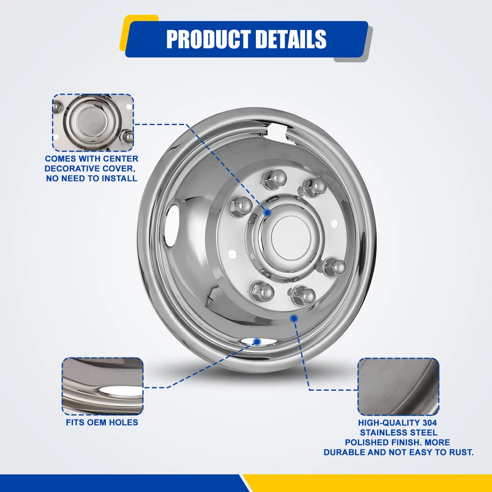17" Dually Steel Wheel Simulators for 2005-2024 FORD F350 Dual Rim Liners Covers γNOTICEγ To save your precious time, please ensure the size, color, and other information before making a purchase. If you have any questions, please feel free to contact our customer service at any time. Fitment For 2005-2024 Ford F350/F-350. Feature Made of high quality 304 Stainless Steel and Polished keep away from stains, fading, dirty. Give any vehicle a unique, aggressive look at a fraction cost. The product undergoes rigorous mechanical testing before leaving the factory to ensure the best performance and enhanced durability. Easy to install ,Lifting the vehicle is not necessary for installation. Easy care and maintenance ,You will just be able to wash off with soap and water and they will keep their shine for years! Specification Type: Hub caps. Color: Silver. Material: Stainless. Compatible Wheel Diameter: 17 in. Installation Type: Bolt on truck. Design: 8 Lugs 5 Hand Holes Dually Wheel Simulators. Packages Dimension: 19.09 *19.29*12.4 Inch. Packages Weight: 16.53 lbs. Packages Included Set of 4 Dually Wheel Simulators Installation Tool Kit Payment Delivery details Terms of sales About us Contact us Payment π€ We accept PayPal (Recommended), credit card, VISA, Google Pay & Discover etc. π€ Please submit your payment within 7 days after your purchase. π€ If not, eBay will automatically open an Unpaid Item Dispute on our behalf if the item(s) are not paid within 7 days. Delivery details π€ Please double check your delivery address and contact information. π€ All items will be shipped within 1 business days after payment received. π€ Tracking numbers will be easily accessible ASAP they are created and processed. Terms of sales π€ Free 60 days Return, we will cover the return post fee. π€ If a defective product was received, please do not hesitate to message us via eBay message. π€ We will response in 24 hours in business to resolve the problem π€ We stand behind our products. Items can be returned for exchange or full refund within 60 days from the date you receive. About us π€ Winjet has a huge warehouse and office located in the United States. π€ All US domestic 48 states customers are able to benefit from the FREE SHIPPING services. π€ Our experienced, professional customer service representatives offers prompt and courteous service. π€ Best quality products, outstanding services and professional experience keep our customers. Contact us π€ Please feel free to contact us if you have any problems. π€ Emails will be replied within 24 hours in working days. π€ After hours emails will be replied on the next business day. Brand WINJET Color Polished Stainless Steel Type Wheel Simulators Manufacturer Part Number 0085 Placement on Vehicle Front, Left, Rear, Right Material Stainless Steel, Steel Superseded Part Number 8 lugs 4 Hand Holes Dually Wheel Simulators, 17" 2005-2024 F350 Bundle Listing No Vintage Part No WHAT IS INCLUDED 2 FRONT & 2 REAR BOLT ON SIMULATORS & HARDWARE Interchange Part Number 3615, 8 Lug bolt, 200mm, chrome, SD, deep dish, F450 front rear deep dish chassis cab R17 tires Manufacturer Warranty 1 Year OE/OEM Part Number 2005-2024 F350 8 lugs 4 Hand Holes Dually Wheel Simulators Number in Pack 4 Features Anti-fade Protection, Car Wash Safe, Easy to Install Country/Region of Manufacture United States Universal Fitment No Finish Polished Stainless Steel Compatible Wheel Diameter 17 in Performance Part No On Feb 20, 2025 at 23:37:34 PST, seller added the following information: