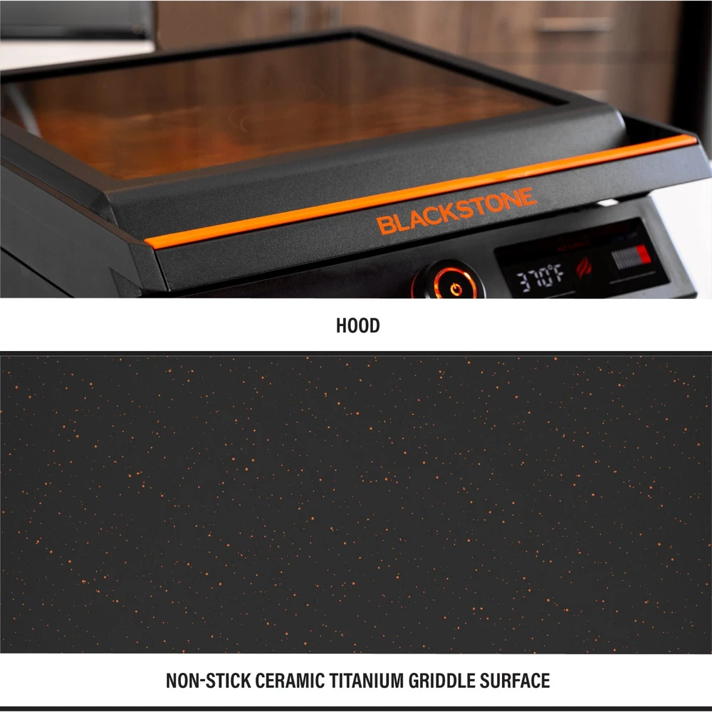 Product details Introducing the Blackstone E-series 17" Electric Tabletop Griddle with Hood. This 17" E-Series Griddle is a brand new style from Blackstone and is perfect for any occasion, whether it be indoor or outdoor. The 238-sq-in griddle plate is machine cast with a durable and elegant ceramic-titanium coating. It has a clean-catch, low profile, rear grease management system. The entire grease cup is dishwasher safe making cleanup simple. You can rotate and remove the E-Series hood for ease of use. Control the temperature with the EZ-Touch control dial and the large LCD Display. If you are new to Blackstone cooking or in the market for an indoor griddle with outdoor performance, this is the griddle for you. Blackstone's first electric griddle for indoor and outdoor cooking 238-square-inch cooktop surface Clean-catch low profile patented rear grease management system makes clean-up quick, easy, and discrete Large LCD digital display for easy readability The patented rotate and remove glass hood provides sleek protection and traps heat for cooking and steaming Non-stick ceramic titanium coated griddle surface for easy cooking and clean-up Dishwasher safe grease cup EZ-Touch control dial is easy to use and control Space to cook up to 9 pancakes, 12 eggs, or 4 steaks 1500W/120V/5A/60HZ Electricity requirements This item has passed certification for an IPX4 rating and a 4-hour rain exposure test. Note: Do not submerge this griddle or attempt to use in the rain. Assembled dimensions: 17.89" L x 18.7" W x 6.97" H NOTE: Existing Grease Cup Liners do not fit the E-Series grease cup. Grease Cup Liners fit Blackstone propane griddles only.