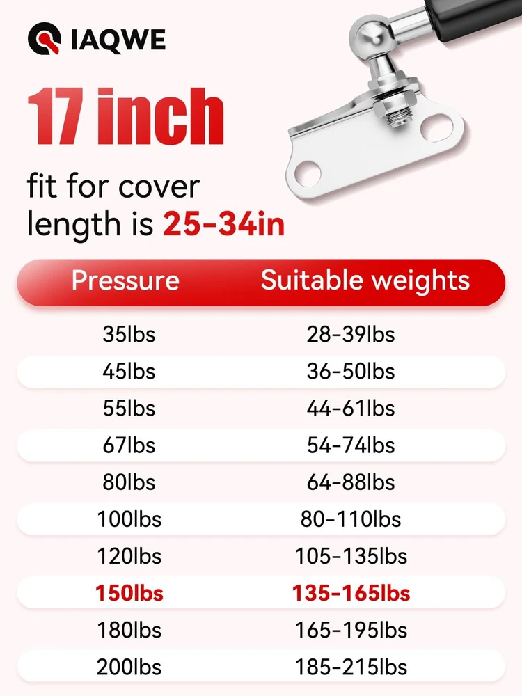 17Inch 150Lbs/667N Gas Struts Spring Shocks Lift Support with L Brackets for RV Murphy Bed Heavy Duty Tool Box Cabinet Trap Basement Door Floor Hatch Lid Truck Canopy Cover Trailer 2pcs by [GAS STRUTS PARAMETER] Force: 200Lbs 20 Inch per Strut, a pair of 2 struts. Extended Length: 16.96”, Compressed Length: 10.80”. Ball Joint Diameter: 10mm. Very Strong! Can not compress directly by your hands. [150LBS 17 INCH GAS STRUTS] Suitable for RV Queen Bed, travel trailer ramp, Camper Shell, Bar Window, Tonneau Cover, Chicken Coop, Heavy Duty, Large Cabinet, Floor Hatch and so on. [150LBS GAS STRUTS] Package include Struts* 2 with L-type Mounts* 4, Installation Guide* 1. Scope of application: 113-165lbs Lid Cover. [PREMIUM 17 INCH GAS SPRING]: gas spring can work normally in patio, topper window, Underground hatch, boat, garbage bin cover, tool box lid, tent and other outdoor areas. As the best and reliable gas spring manufacturer, will always stand behind you to provide you with the strongest support. [GAS SPRING SUPPORT] Any installation and adaptation issues, just mail us via Amazon, and we will solve for you within 24 hours. Shipping We offer FREE shipping on all orders! We ship within Three business days of payment, usually sooner. We use a selection of shipping services such as UPS, FedEx, USPS etc. We only ship to the lower 48 states, no APO/FPO addresses or PO Boxes allowed. Local pickups and combined shipping options are not provided at this time. Return You can return a product for up to 30 days from the date you purchased it. Any product you return must be in the same condition you received it and in the original packaging. Please keep the receipt. Payment We accept payment by any of the following methods: PayPal Please pay as soon as possible after winning an auction, as that will allow us to post your item to you sooner! Feedback Customer satisfaction is very important to us. If you have any problem with your order, please contact us and we will do our best to make you satisfied. Contact Us If you have any queries, please contact us via ebay. We usually respond within 24 hours on weekdays. Please visit our eBay store to check out other items for sale! Thank you for shopping at our store.