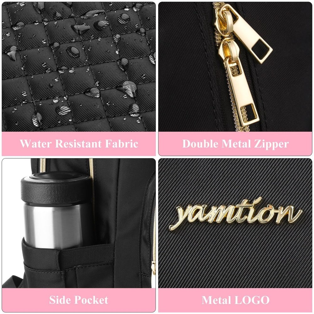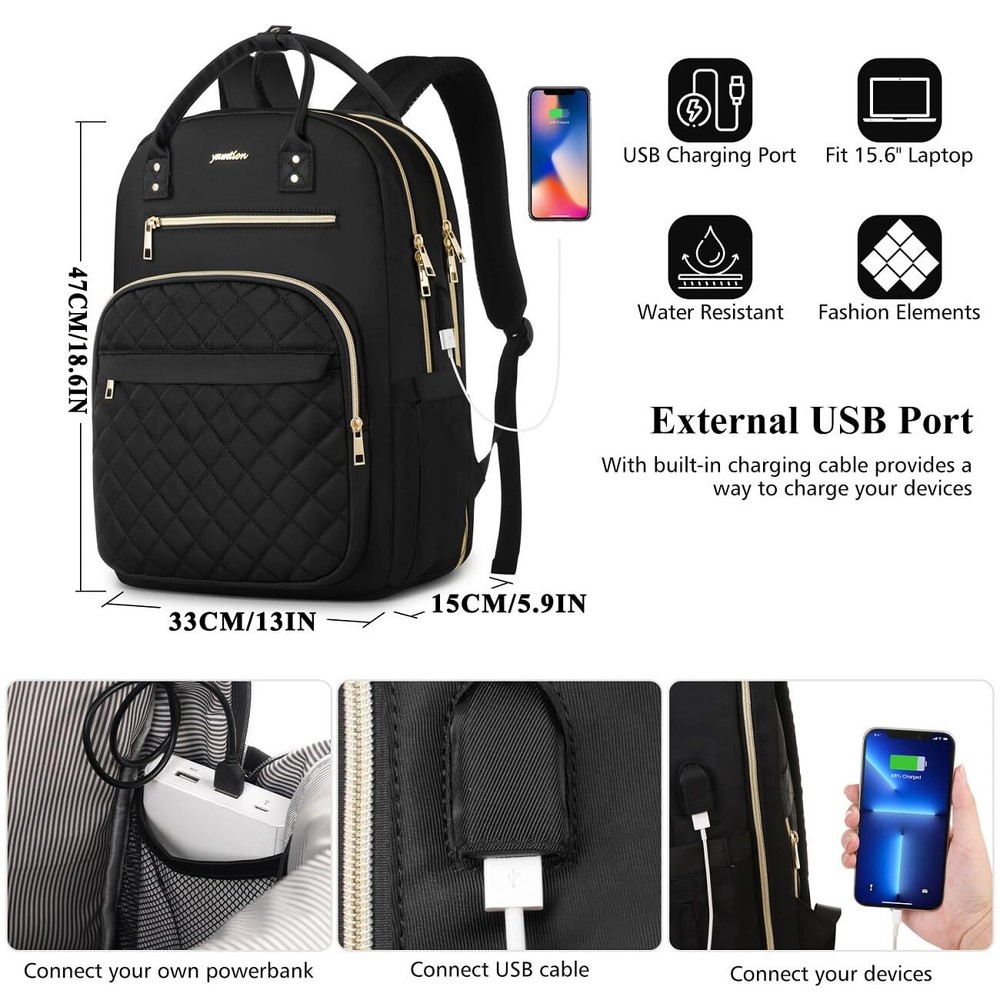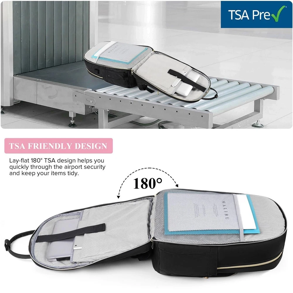 Upgraded Waterproof Fabric The texture is more detailed,the touch is softer,and the fabric is more shiny.There is a support at the bottom of the backpack,which can keep standing when not carrying things. Power Bank Pocket There is a special pocket for storing the power bank inside,so that it can be stored stably in the laptop backpack and will not be disconnected due to bumps. Upgraded Side Pocket The upgraded elastic side pocket can hold water cups and umbrellas.Its unique paper drawing design can perfectly fit the napkin. Details of Backpack Size:18.6*13*5.9in Capacity:35L Weight:1.6lbs For girls and women Laptop:13.3",14",15.6",16",17",17.3" Occasion:School Work Travel Package includes Womens Backpack x 1 USB X 1 【SIZE AND CAPACITY】18.6 x 13 x 5.9 IN.35L.Ideal for school,office work,city trip,business travel.Separate laptop compartment for 13.3,14,14.4,15,15.6,17.3 inch Laptop/Macbook.Tablet compartment for 9.7,10.2 inch. 【TSA AND LUGGAGE BELT】TSA-Friendly Backpack is exclusively designed for airplane flight travel.At checkpoint,unfolds the laptop travel backpack freely 90-180 degree and the laptop stays flat without taking it from the bag.Luggage belt on the back is great to slide over the luggage tube and attached to your rolling luggage securely for easier transport.The back anti-theft pocket protects your personal items well. 【WATERPROOF AND FASHION TRENDS】Fabric of the womens bookbag is superior to the ordinary Oxford fabric on the market.Soft to touch,waterproof and shiny.Checker Embroidery Design,in line with the current market trend.Best gift of backpack for women. 【USB NEW DESIGN】With the built-in charging cable inside,this usb backpack offers you a more convenient way to charge your phone while walking.Compared to other ordinary USB exposed, we wrapped the USB connector hole with fabric,the school backpack looks more elegant and beautiful. 【MORE DETAILS】Premium brown and white quality striped lining,pen insert pockets for work and school,interior mesh pocket for easy storage,and a key fob to store your keys.(Age:over 3 years old)