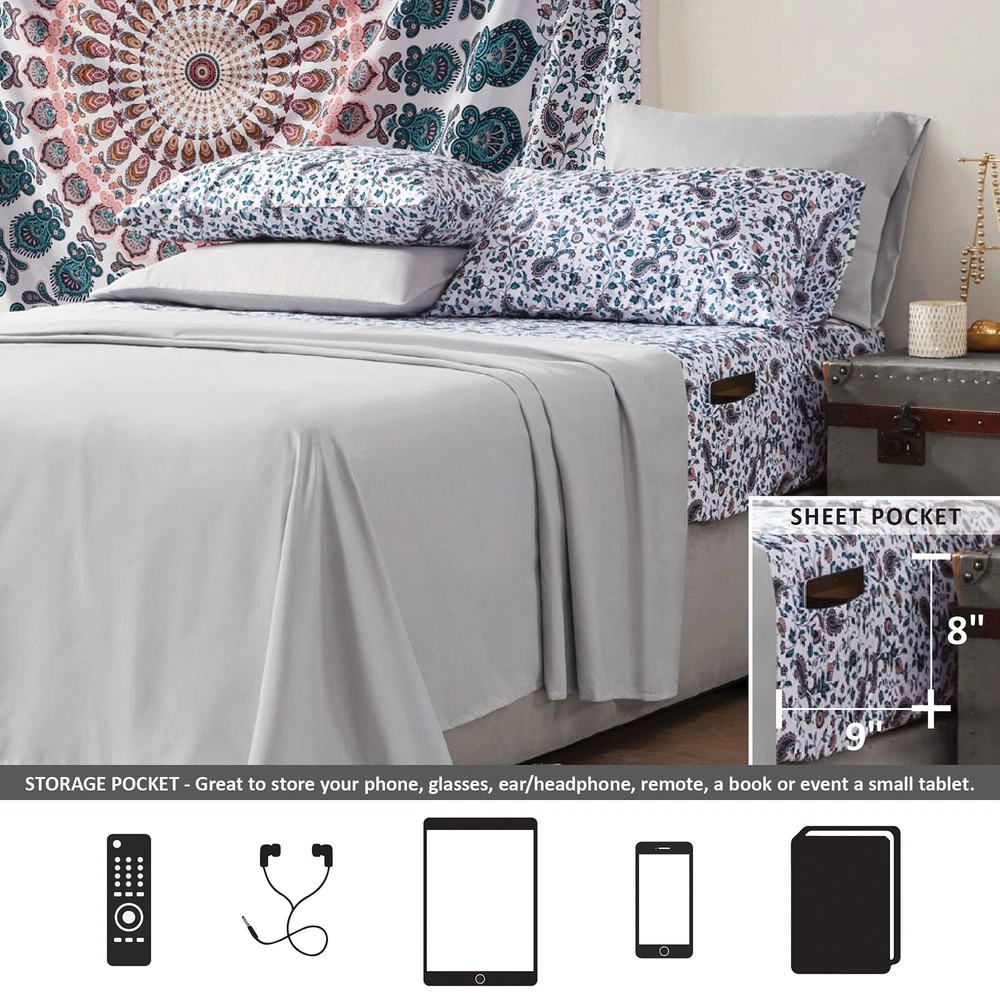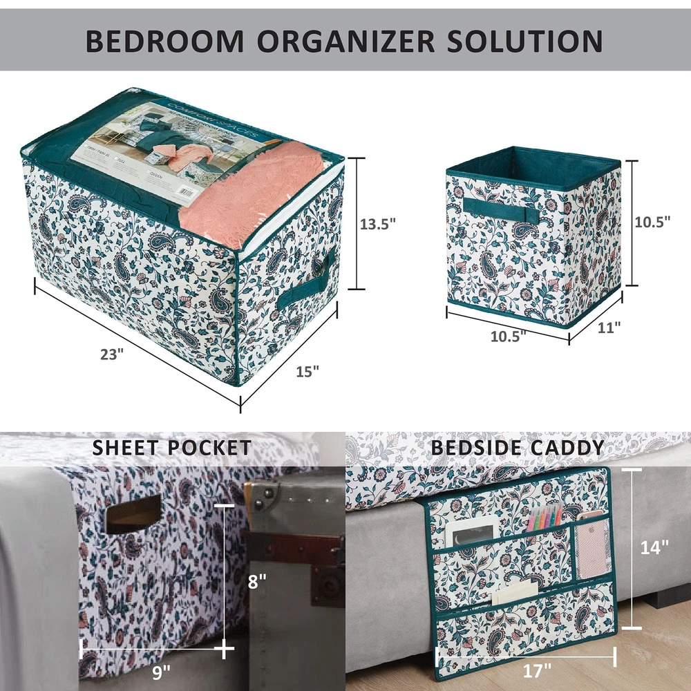 Start your new beginning with our dorm essential pack to keep your spirit up with beautiful and comfortable bedding set! The comforter set comes with innovative and matching organizers. The matching under storage bed, cubby and sheet with pocket will free yourself from clutter to stay effective, focus and increase productivity. The set also comes with headboard pillow and matching throw for added convenient and comfort. It comes in a gift ready bundle; perfect for graduation and off to college presents. Start your new beginning with our dorm essential pack to keep your spirit up with beautiful and comfortable bedding set! The matching understorage bed, cubby and sheet with pocket will free yourself from clutter to stay effective, focus and increase productivity. The set comes with headboard pillow and matching throw for added convenient and comfort. Set includes: 1 Comforter: 88"W x 92"L, 2 Standard Shams: 20"W x 26"L, 1 Flat sheet & Tapestry: 90"W x 102"L, 1 Flat sheet: 90"W x 102"L, 2 Fitted sheets: 60"W x 80"W + 13"D, 4 Pillowcases: 20"W x 32"L, 1 Headboard pillow: 24"W x 30"L, 1 Throw: 50"W x 60"L, 1 Pillow: 16"W x 16"L, 1 Bedside Caddy cardboard: 17"W x 14"H, 1 Collapsible Storage Cube: 10.5"W x 10.5"L x 11"H, 1 Under bed storage bag: 23"W x 15"L x 15"H For your convenience bedding set is machine washable. Do not use bleach. Pillow is spot clean only. Commercial size washer and dryer is recommended for best result.