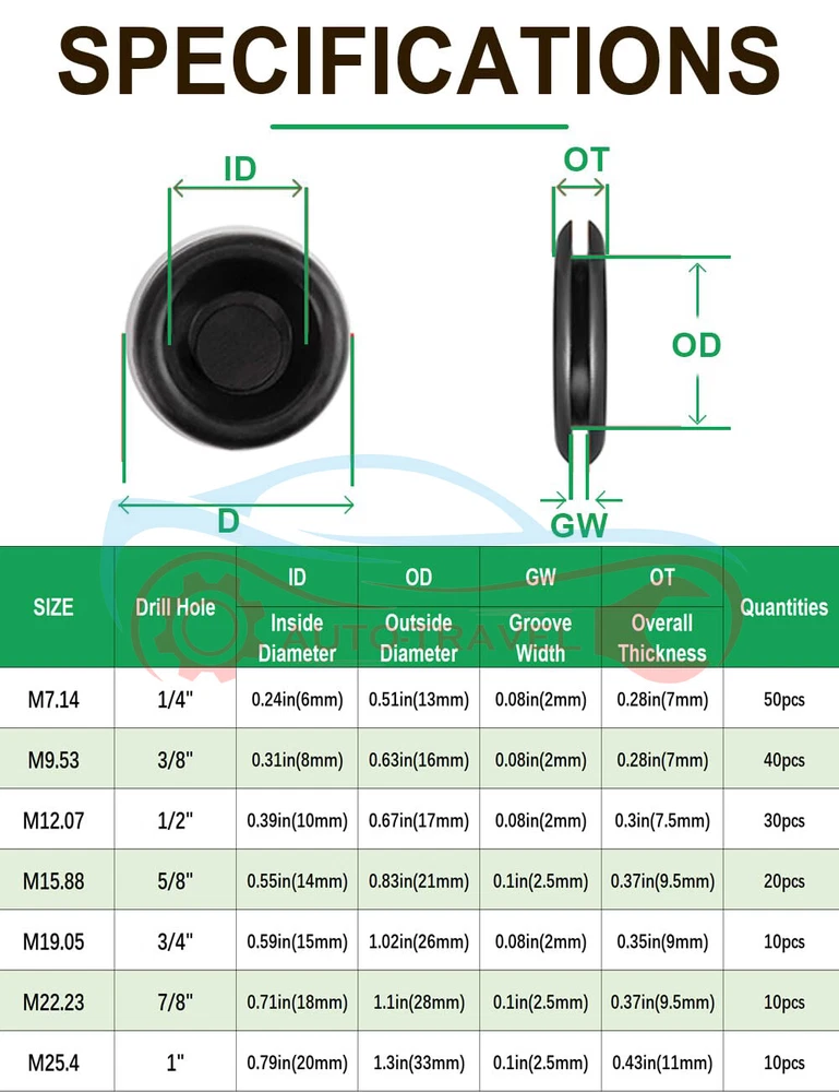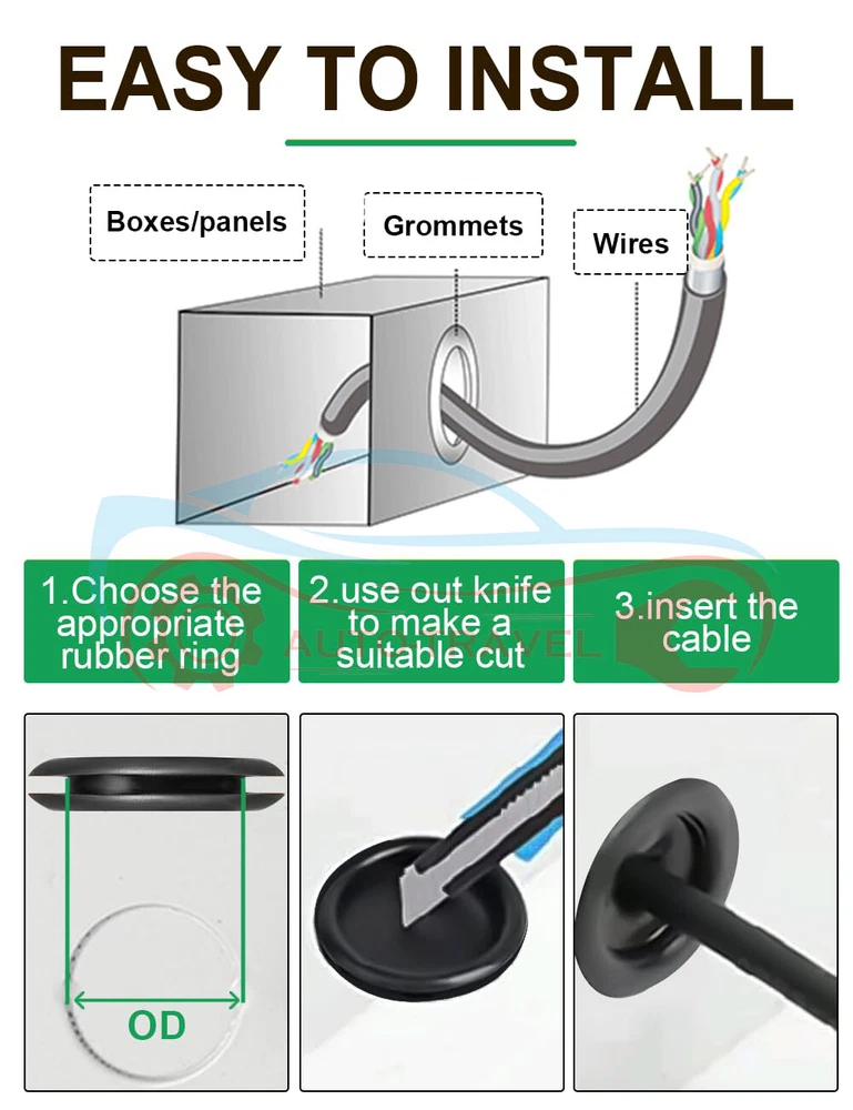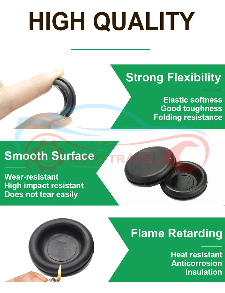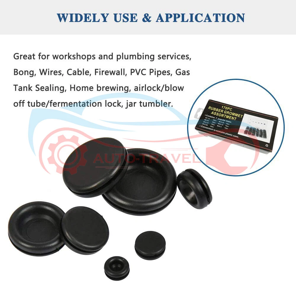 High-Quality Material: Premium ubber grommets made of natural flexible synthetic rubber material, strong flexibility, anti-aging, folding resistance, strong insulation protection function; Non-toxic tasteless, comfortable and delicate appearance; Pass the EU RHOS 2.0 test Firewall Hole Plug Set 170 pcs rubber grommet in 7 common sizes.50 pcs. 7.14 mm; 40 pcs. 9.53 mm; 30 pcs. 12.07 mm; 20 pcs. 15.88 mm; 10 pcs. 19.05 mm; 10 pcs. 22.23 mm; 10 pcs. 25.40 mm Multiple Size: Variety of size are all in one box; Diffrents sizes can meet your desire of working, allows you to protect against fire hazards, run wire through sheet metal, fire wall, frame, dry wall Easy to use: Each rubber grommet is flexible and enables simple installation according to the thickness of the cable 170 Rubber Grommet Firewall Hole Plug Electrical Wiring Gasket Assortment Kit High-Quality Material: Premium ubber grommets made of natural flexible synthetic rubber material, strong flexibility, anti-aging, folding resistance, strong insulation protection function; Non-toxic tasteless, comfortable and delicate appearance; Pass the EU RHOS 2.0 test Firewall Hole Plug Set 170 pcs rubber grommet in 7 common sizes.50 pcs. 7.14 mm; 40 pcs. 9.53 mm; 30 pcs. 12.07 mm; 20 pcs. 15.88 mm; 10 pcs. 19.05 mm; 10 pcs. 22.23 mm; 10 pcs. 25.40 mm Multiple Size: Variety of size are all in one box; Diffrents sizes can meet your desire of working, allows you to protect against fire hazards, run wire through sheet metal, fire wall, frame, dry wall Easy to use: Each rubber grommet is flexible and enables simple installation according to the thickness of the cable, the diameter of the rubber plug can be freely cut and easily snapping the rubber grommet directly into the drill hole Application: Cylinder, valve, pump, electrical appliance, chemical pipe, spray, water pipe, decoration, etc; Rubber grommets are commonly used to protect or cover holes and to protect cables or wires from dust rain or sharp corners and edges Payment Delivery details Terms of sales About us Contact us Payment We accept major credit card payments via Paypal. Payment must be received within 7 days of auction closing date. If you do not contact us or respond to our email within 7 days of auction closing date, we do not guarantee the item availability. We reserve the right to cancel any unwanted bids. Delivery details Flat rate shipping charge will be applied to the 48 continental USA States. Extra shipping fee will be charged to ship item(s) to HI, AK, PR, GU, VI, APO, FPO . Item(s) will be shipped via UPS Ground or USPS or Fedex within 3 Business days after payment is received. A Tracking Number will be upload on platform as soon as item(s) is shipped. International buyers please note, we are not responsible for any custom duties, taxes and brokerage fees. For some oversize packages, we may not be able to ship via USPS. Terms of sales All of our items are professionally made and guaranteed to fit. A professional installation is always recommended. Please send a message over eBay if you have any questions. We accept returns within 30 or 60 days after you received the item(s). All returned items must be new and in original package. The buyer will pay return shipping fees. No refund will be made for damaged parts. Shipping and handling fees and insurance fee are not refundable. About us Our warehouses are located in CA and NJ The transportation time is approximately 3-5 working days Contact us Your satisfaction is our top priority. We stand behind all products that we sell. If you have a problem with any of our listings, please allow us to work it out. Our business times are Monday-Friday 9:00- 5:00 Pacific Time. Office closes on weekends and holidays. We are striving to earn a 5- star rating with every purchase. Please take a moment to leave us a positive feedback when you receive your order. If you are not satisfied, please let us know before you leaving feedback. Please always include your purchase eBay item number in the mail whenever you have any questions.