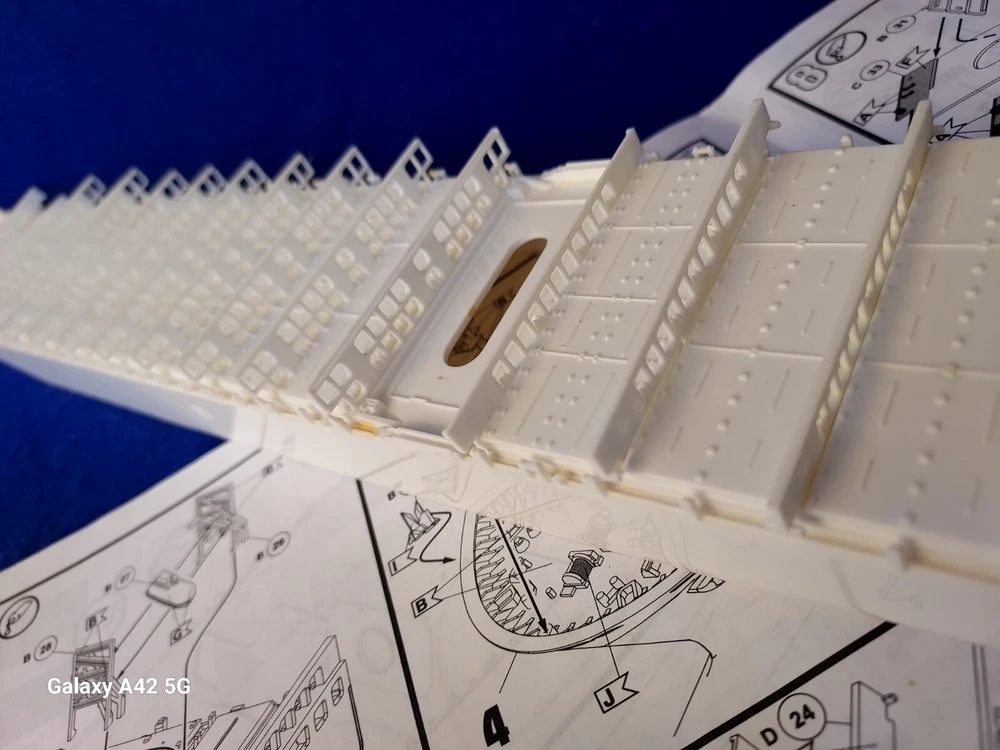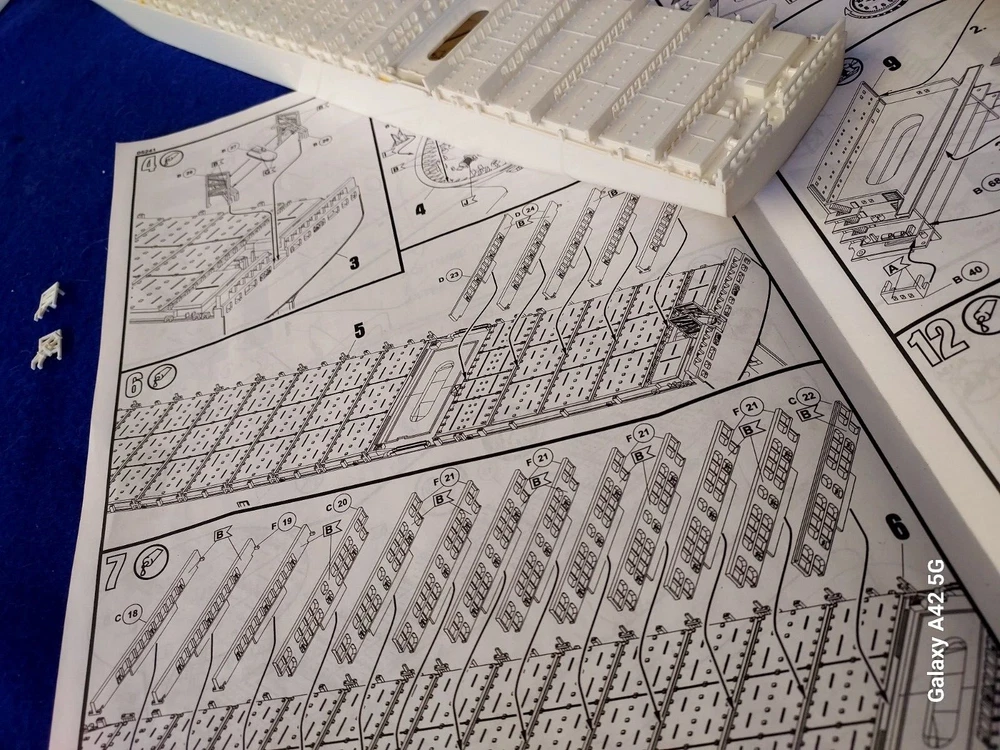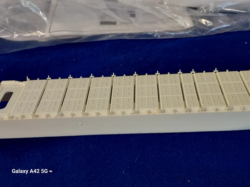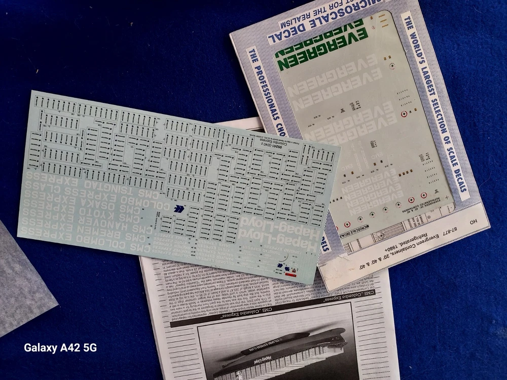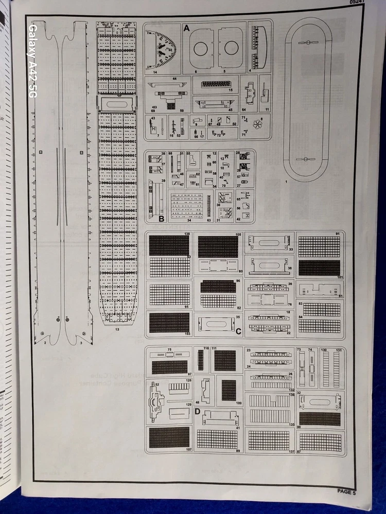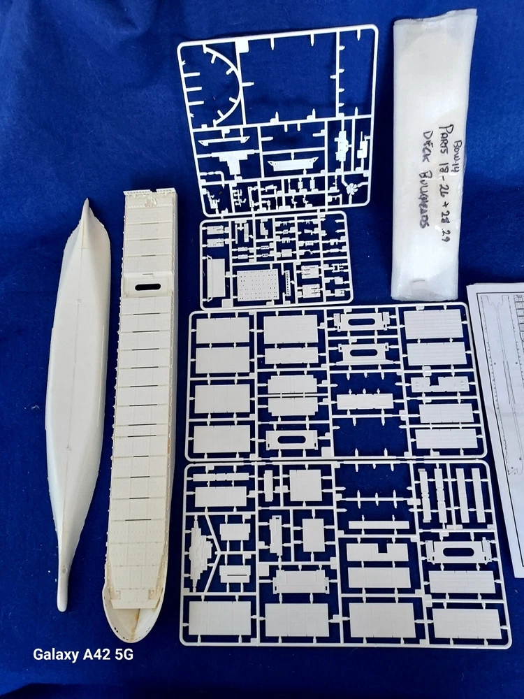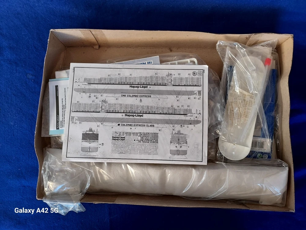 ONE OF A KIND: Revell Germany 05241 1/700 Hapag Lloyd Container Ship COLOMBO EXPRESS I have WATERLINED the hull. SEE PHOTOS The model kit has been started..main deck is attached and internal bulkheads applied;.essentially nothing more than was needed to waterline the ship. The photos don't show clearly; the waterline is straight...no warpage. Some parts have been removed from the sprues and cleaned up; primarily the above-deck Container bulkheads. These and the forcastle are shown installed for the photos only; they were not glued....They have been carefully packaged with the stand and marked. Also the stern boat skids are seen in the upper left of the photo showning the bulkhead directions..they are in that package as well. The model kit is complete, waithing to be finished. I've included decals to letter the ship for EVERGREEN (I was going to paint the hull green and do that but couldn't find alternative 1/700 decals for the containers. HO container decals are about the right size for that. The kit decals are in like-new condition. A fun project to research and start but now a round-tuit for you to finish.The kit will be carefully packed SEE PHOTOS