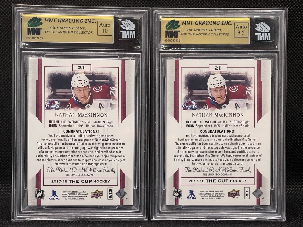 17-18 The Cup Nathan MacKinnon Patch auto Gold 1/8 & 8/8 Both Cards included Will ship via UPS/FED EX as long as Canada post is still on strike.