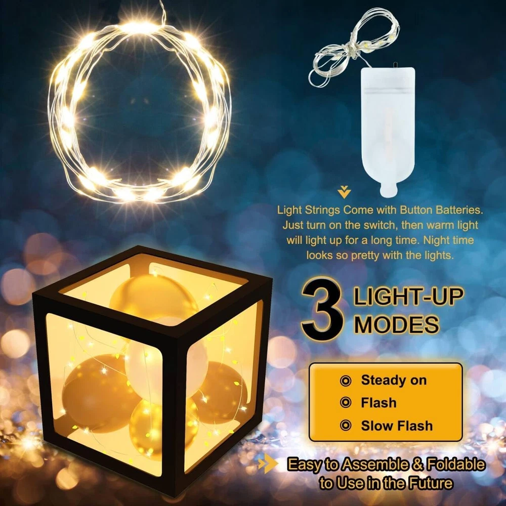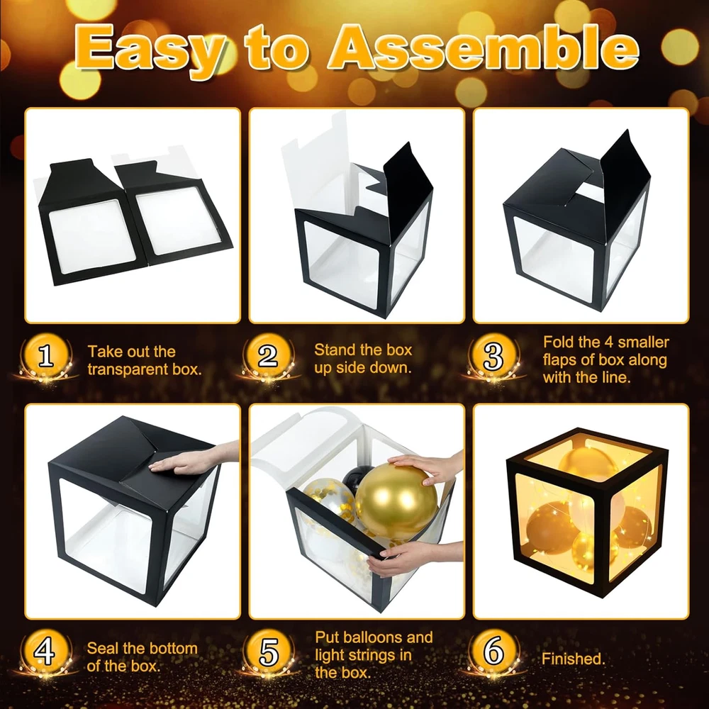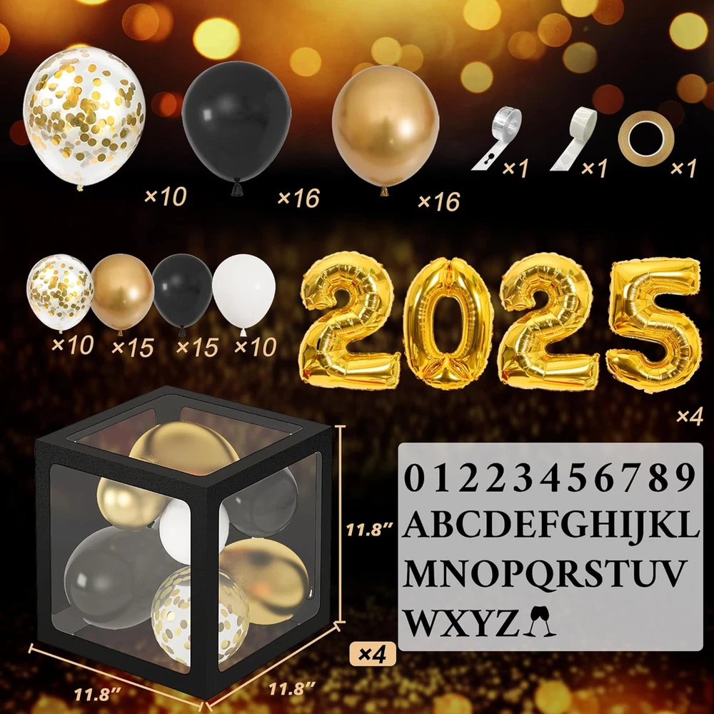 Rich and Reusable New Years decorations 2025: You’ll get 4pcs balloon boxes, 4pcs lights, 64pcs black letters(2sets) /number(0-9+2)/champagne stickers, 4Pcs 16" 2025 foil balloons, 20Pcs 12" 5" gold confetti balloons, 62Pcs 10" 5" black and gold balloons, 10Pcs 5" white balloons and 3pcs balloon tools Eternal Black and Gold Balloon Arch Kit: Decorate New Year eve party with beautiful black and gold balloons and balloon boxes, shine and glitter; With attractive New Years balloon arch kit 2025 as backdrop, create festive vibe for your glamorous pictures Gorgeous Party Decorations: Need unique 2025 New Years eve party supplies ; Don’t miss this; Put sizes of black and gold balloons into 4 balloon boxes to add relaxing vibe; Desired for office, classroom, home festival celebrations, warm and unforgettable Infinite DIY Fun: Our New Years decorations give you new experiences and various options; Letters and numbers can be combined together to form blessings; Easy to assemble; Lights can also be hung on the tree, wall, window, door to create unique nye party Decent Quality: Our balloon boxes are made of great-quality and transparent plastic; New Years balloons is also made of thick latex, not easy to break; All these nye decorations 2025 add luxurious vibe; Farewell 2024; Brighten and welcome your 2025 Product Description